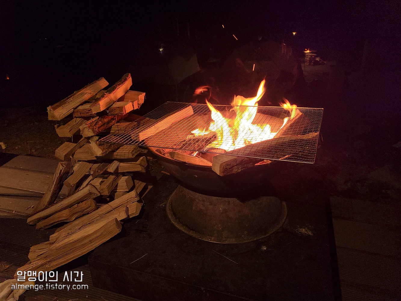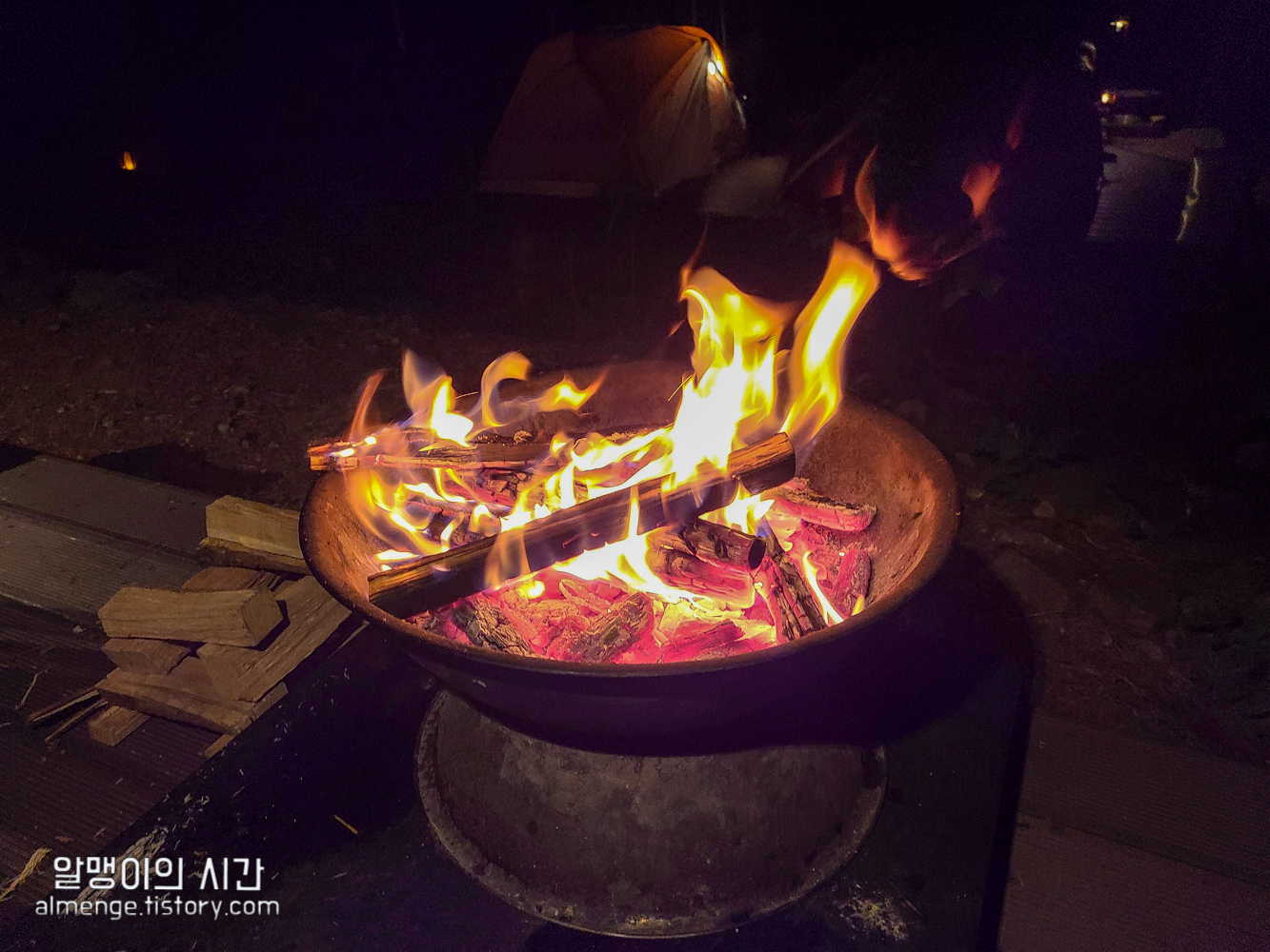 아 호잣캠에선 화로대를 무료로 대여해준다. 화로대는 쓰레기통 옆에 쌓아져 있는거 자유롭게 가져다 쓰고 담날 나가기 전에 도로 갖다 놓으면 되는 시스템.