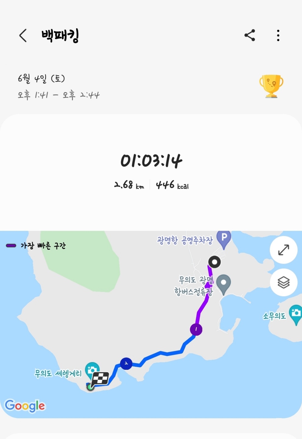 검색한 정보대로 따라갔더니 정확히 1시간 만에 드디어 박지 도착! 초과된 3분은 도착해서 워치 운동 종료 안한채로