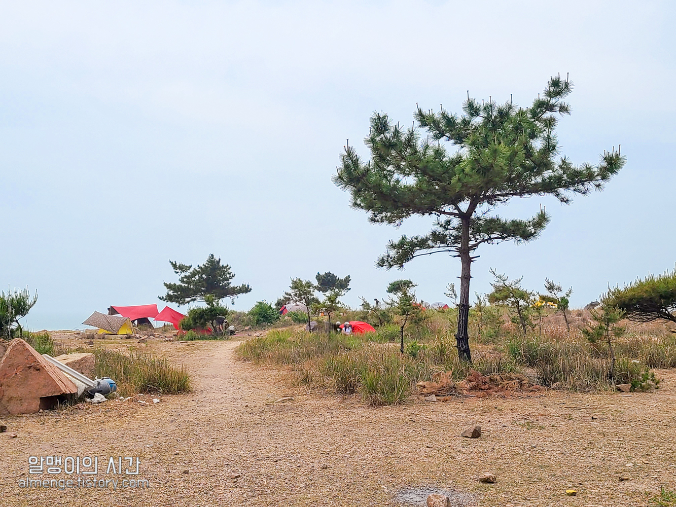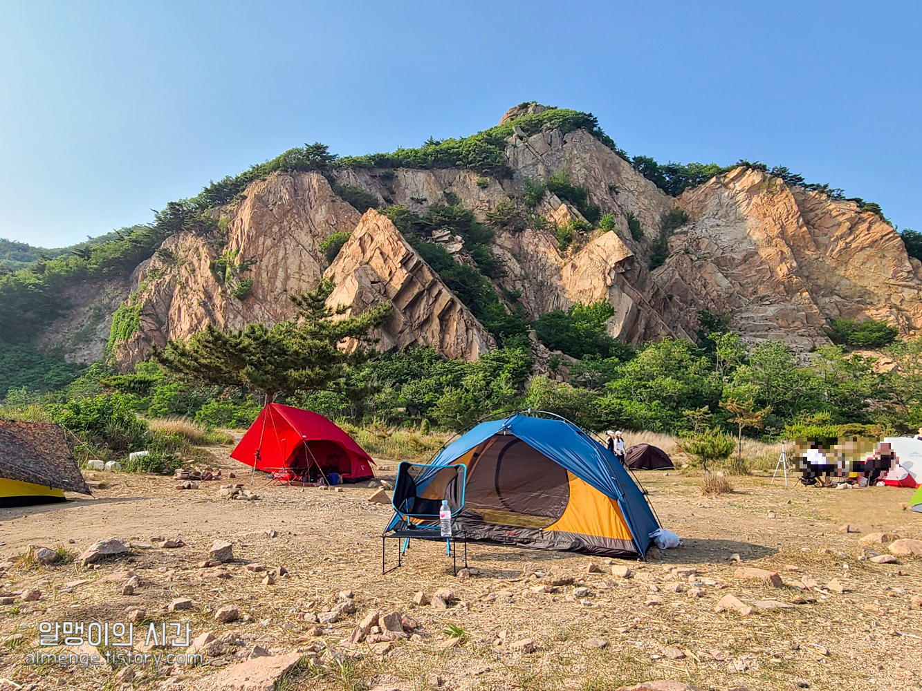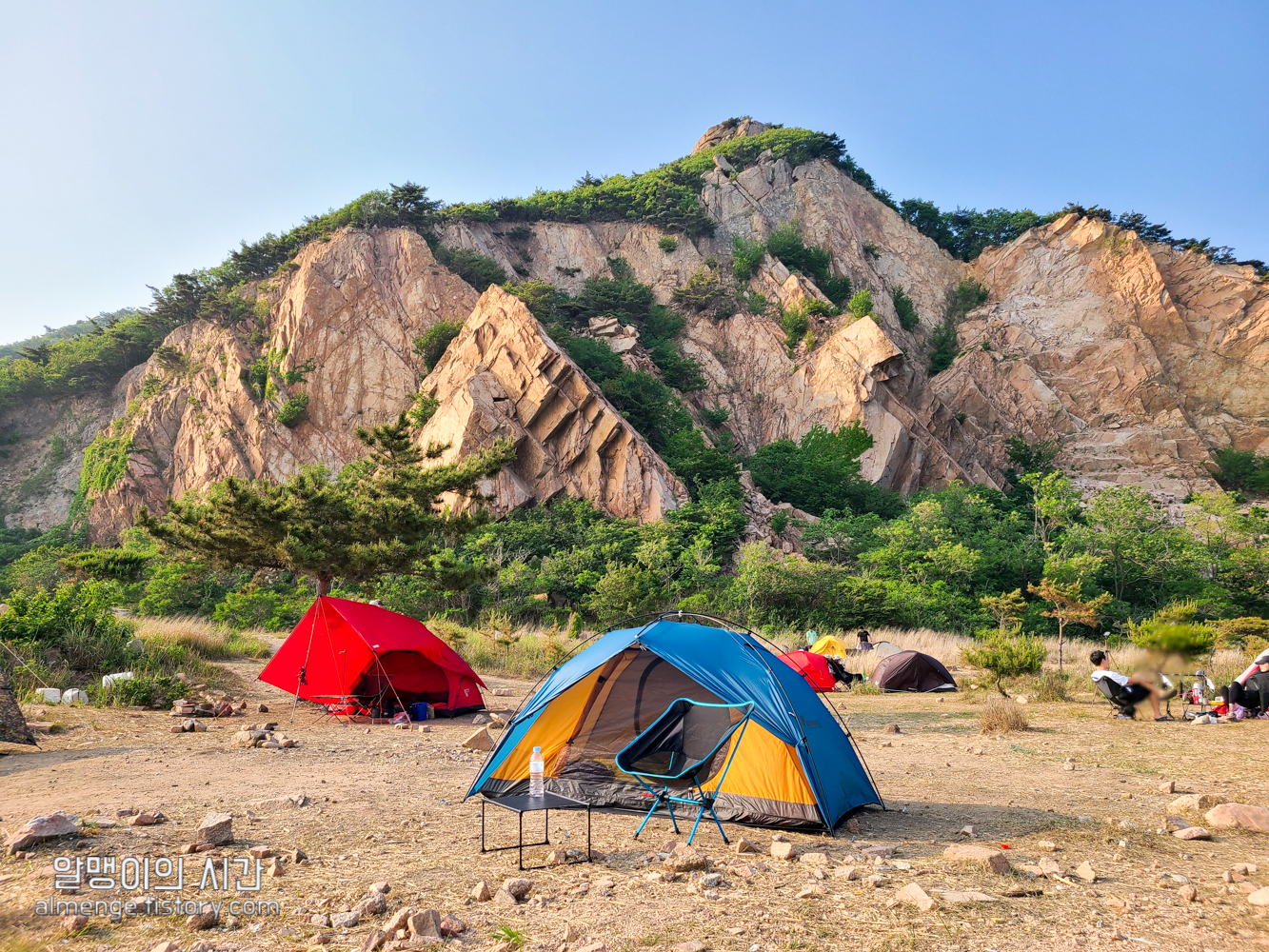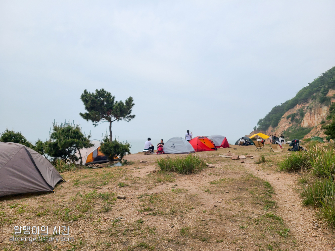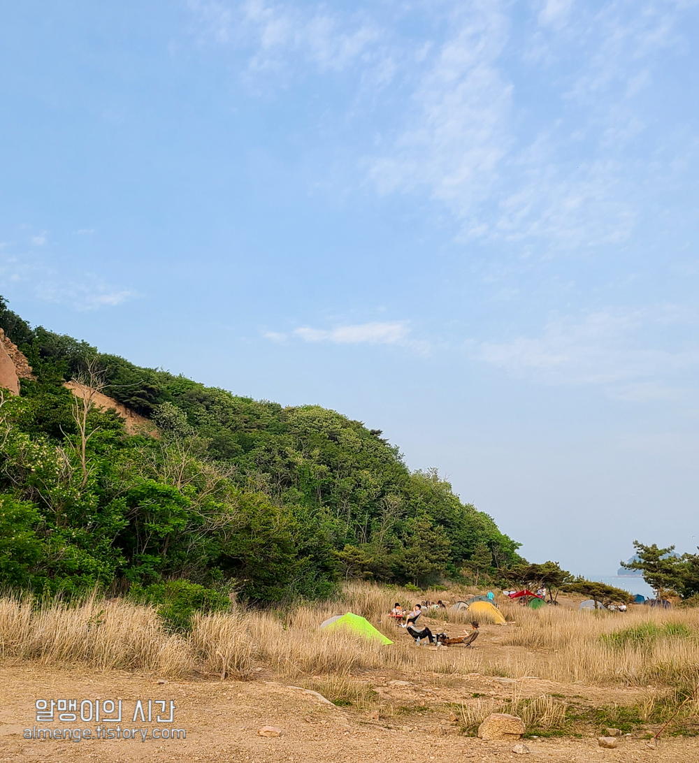 나무그늘 밑을 선호하는 사람, 바람 막아줄 돌담이나 수풀 뒤를 선호하는 사람, 바다앞 1열 자리를 선호하는 사람 등등.... 근데 내가 토요일 오후 2시 40분쯤 도착했을 땐 바다앞 1열 자리가 가장 먼저 차 있었고 바위 절벽에 가까울수록 텐트가 거의 없었다가 사람들이 계속 오고 저녁이 되니 바위 절벽쪽 뒷 자리도 점점 찼었음.