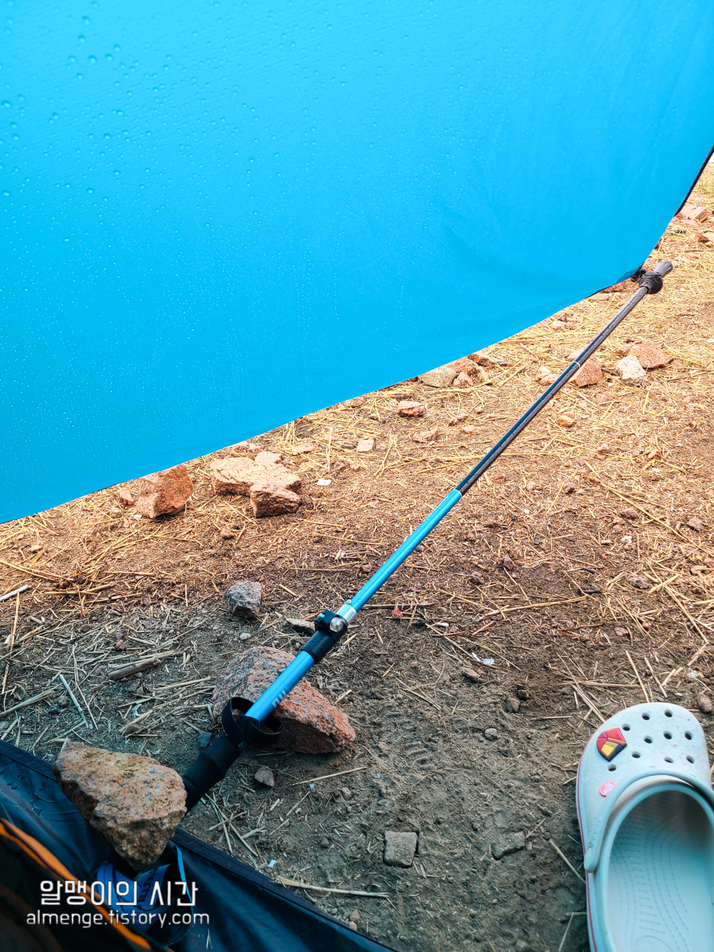 주위에서 큰 돌을 주워와 가까스로 팩다운을 하긴 했지만 땅이 워낙 단단해 팩이 잘 안들어감. 땅 자체도 딱딱하지만 땅 아래에도 돌이 깊게 박혀 있는 경우가 있어 팩 박으면서도 잘 살펴보는게 좋음. 나도 팩 하나 휘어먹을 뻔...