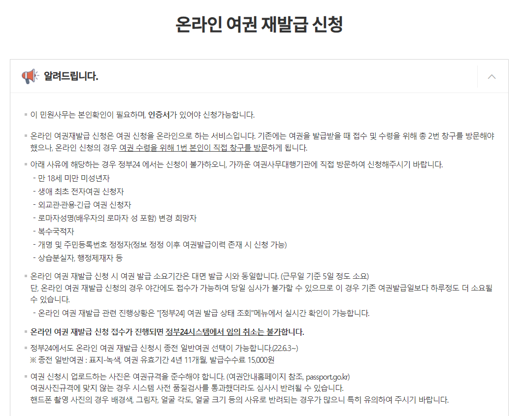 -여권에 기재된 영어 성명(배우자의 로마자 성 포함) 변경 희망자, 상습분실자(5년이내 2회 이상 또는 5년 이내 1회이면서 유효기간이 경과하지 않은 유효한 여권이 존재하는 경우), 잔여유효기간 부여 재발급 희망자 등은 온라인 접수 불가