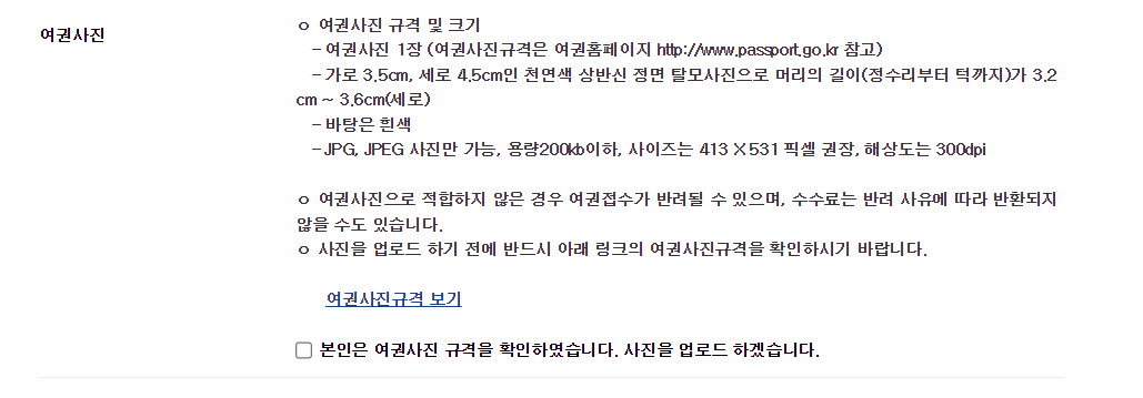5. 모든 정보 입력이 다 끝났다면 마지막으로 여권사진 파일을 업로드해야해요. 위의 규정 다시 한번 확인하신 후 아래 체크박스에 체크하면 사진 업로드하는 곳이 생겨요. 사진 파일 선택 후 업로드 하시면 됩니다.