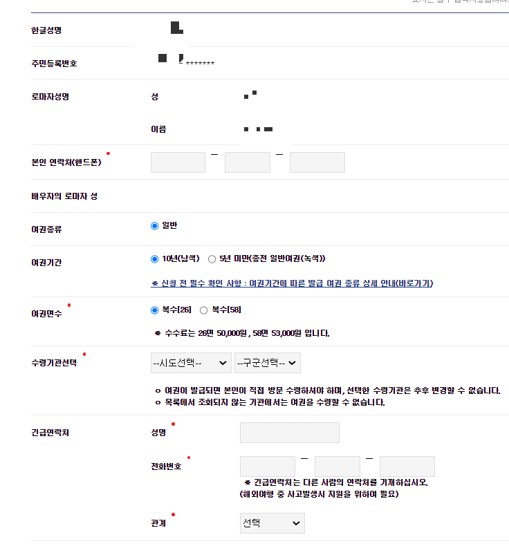 4. 이제 인적사항을 입력합니다. 신여권으로 발급받고 싶은 경우 여권기간은 10년으로 선택하세요. 5년 미만은 기존 녹색여권 재고떨이에요.