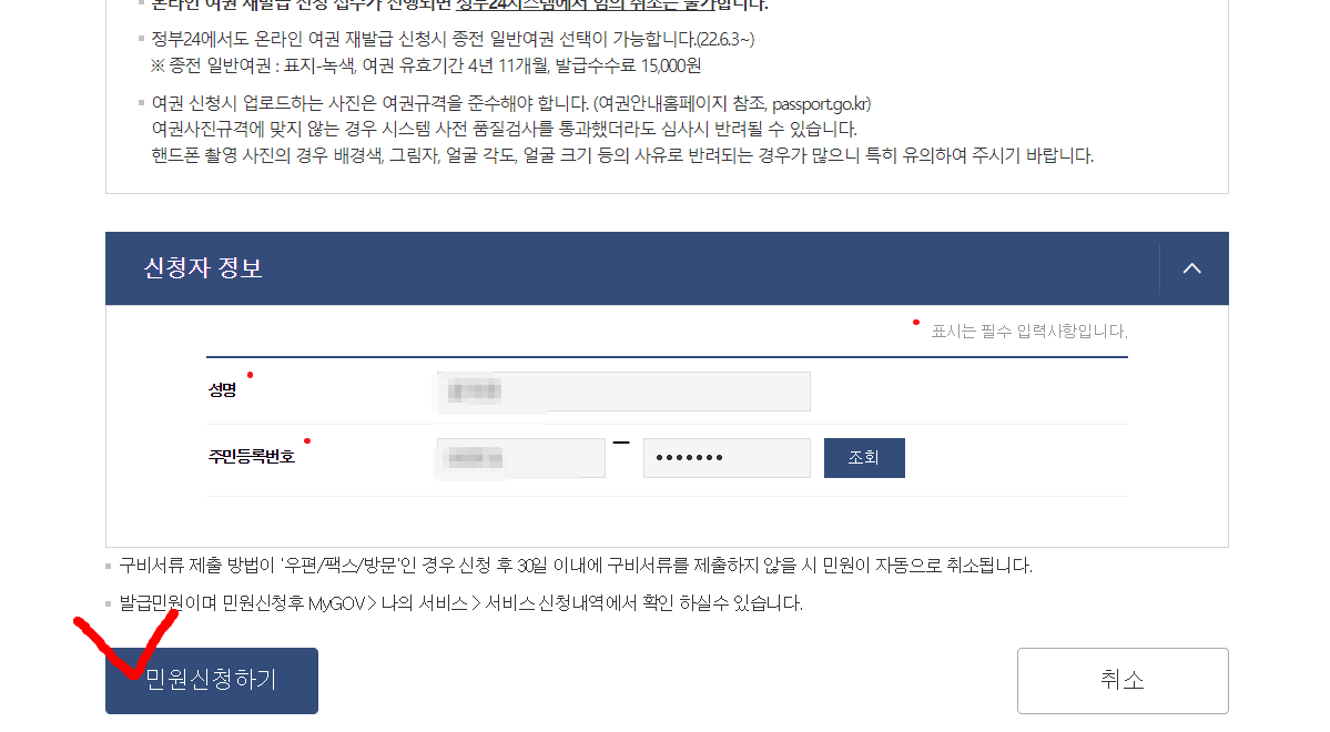 2. 유의사항과 함께 신청자 정보 입력란이 뜹니다. 이름과 주민번호 입력 후 '조회'를 마친 후 '민원 신청하기' 클릭!