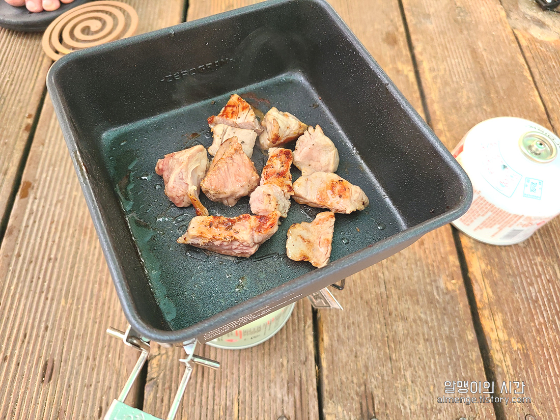 이때까지 백패킹 할 때는 대충 익혀 먹어도 되는 소고기만 싸다니다, 돼지 목살은 첨 먹어봤는데 의외로 잘 익고 팬에 별로 들러붙지도 않고, 무엇보다 맛있다.