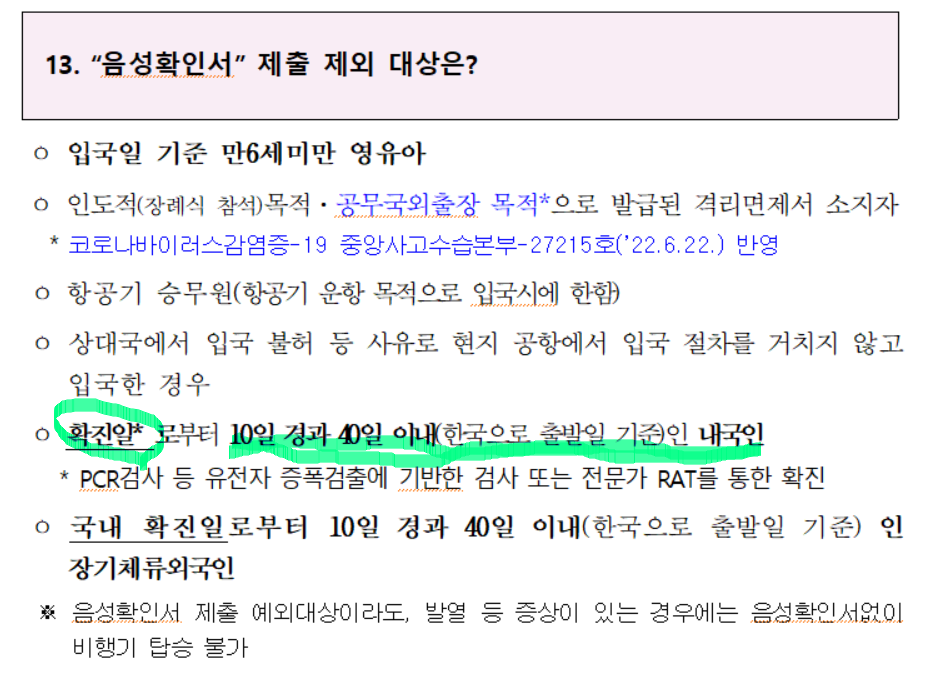 ⭐정리 : 확진일이 귀국편 출발일로부터 10일 전 40일 이내인 경우 음성확인서 대신 필요한 서류