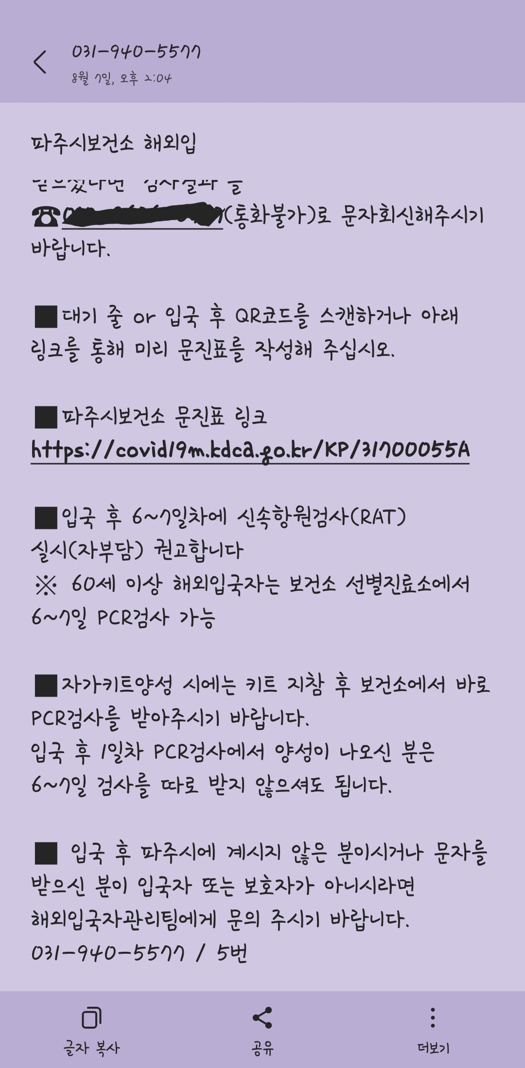 오후에 관할 보건소로부터 위와 같은 문자가 왔어요. 권고사항이긴 하지만 검사결과 나오기 전엔 외출 자제, 입국 후 6~7일 차에 신속항원검사 실시 권고.