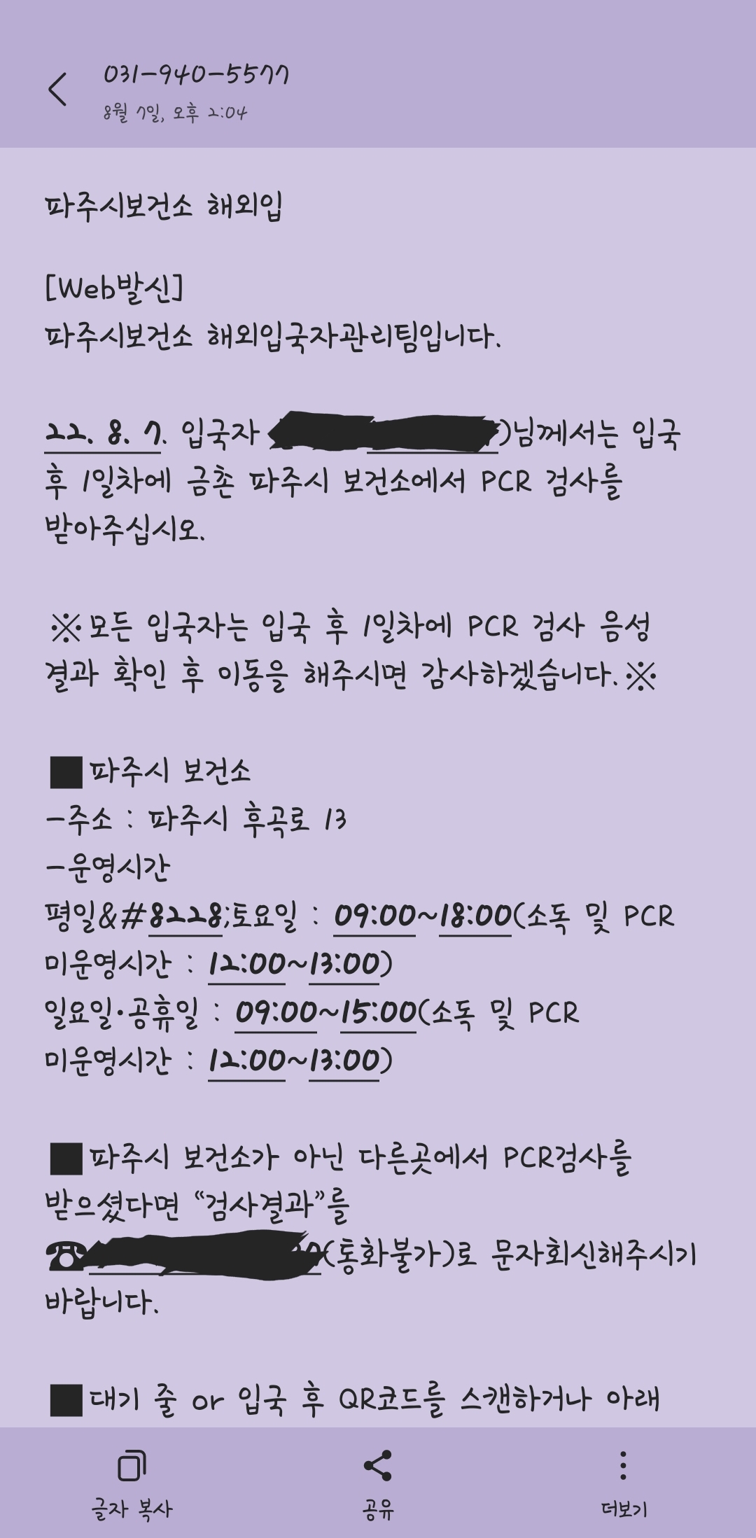 또 만약 관할지역 보건소가 아닌 다른 곳에서 PCR 검사를 받을 경우엔 검사결과를 관할 보건소로 문자전송 해달라고 하네요.