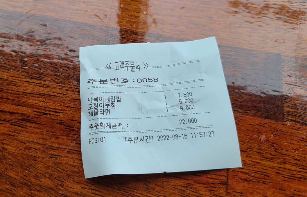 다합해서 22000원. 나중에 김밥 하나 더 추가해서
