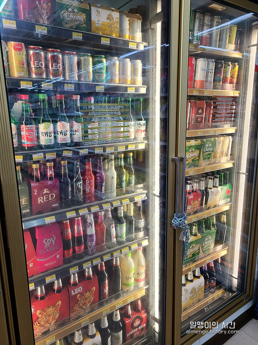만두엔 역시 맥주지(?) 하며 맥주 냉장고로 돌진 했는데 쇠사슬로 굳게 잠긴 술장고 ㅠㅠ 아...태국에선 술을 아무 때나 살 수 없다는 걸 잠시 망각했다. 창 맥주 마시고 싶다규 ㅠㅠ