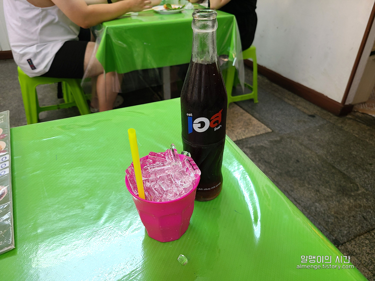 걸어오느라 넘 더워 일단 콜라 먼저 달라했는데 이런 태국 현지 콜라를 준다. 코카콜라는 아니었지만 10바트(370원)니 용서된다 ㅎㅎㅎ 얼음은 2바트를 따로 받는다. 콜라 맛은 뭐, 당연히 코카콜라가 더 맛있다.
