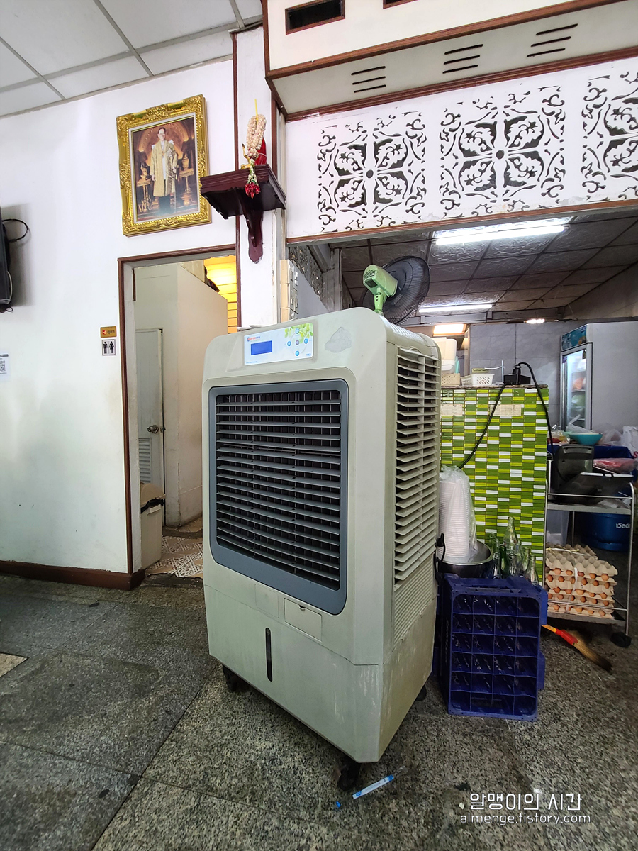 로컬 식당 분위기에 선풍기인지 에어컨인지 모를 커다란 이동형 냉방기가 하나 있다. 사진엔 없는데 2층에도 자리가 있어 테이블은 꽤나 넉넉하게 있는 듯?