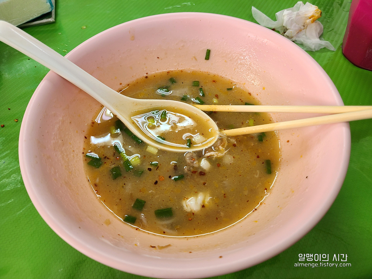 왜 끈적국수라 불리나 했는데 국물의 질감이 살짝 전분기가 있어 걸쭉한 편이라 그런 듯하고, 어떤 맛일지 너무 궁금했는데 막상 먹어보니 왠지 모르게 익숙한 맛이다.