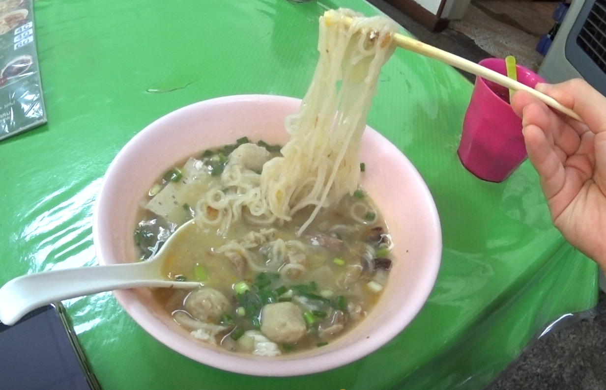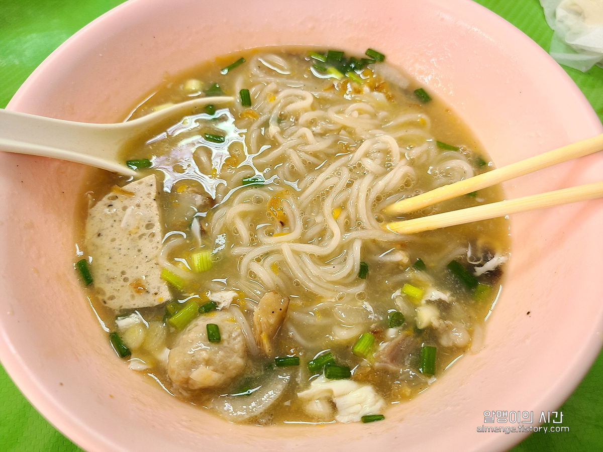 이집에서 파는 국수는 돼지고기 소시지, 삶은 돼지고기, 돼지고기볼, 메추리알, 표고버섯, 양파를 토핑으로 하는 베트남 스타일 태국 국수!