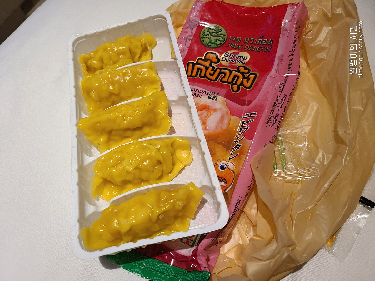 핑크봉지 새우만두 드디어 영접해봅니다. 우리나라 편의점에선 전자렌지 이용이 셀프인데 태국 편의점에선 점원이 직접 렌지에 데워준다 ㅎㅎㅎ 만두를 사니 "Warm?" 한마디 하더니 봉지 뜯어서 야무지게 데워주던 ㅎㅎ