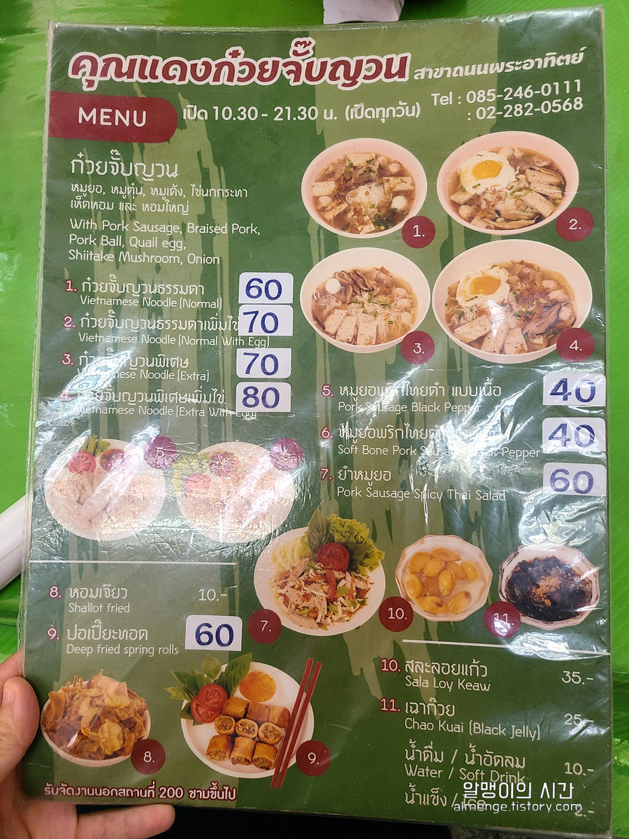 메뉴판을 보면 11번까지 뭐가 써있는데 1, 2, 3, 4번 중에서 고르면 된다. 1~4번만 국수고 나머지는 소시지, 스프링롤, 디저트 같은거. 난 혼자라 국수만 하나 시켰지만 메뉴들이 워낙에 저렴하니 먹고 싶은거 다 시켜 먹어도 될 듯 ㅎㅎ 사랑스러운 태국물가♥