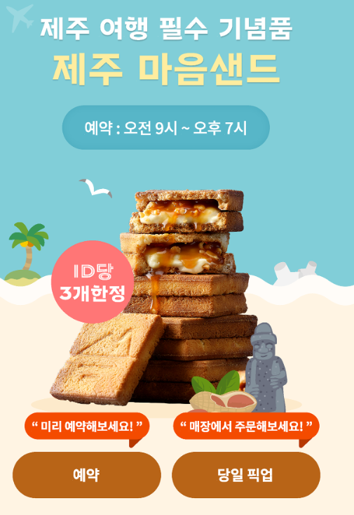암튼 이 글을 여행 전에 보신다면, 파리바게트 앱을 통해 제주 마음샌드를 미리 예약하고 가세요 ㅎ 예약할 경우 원하는 시간에 수령하는 것도 가능하다고 하네요.