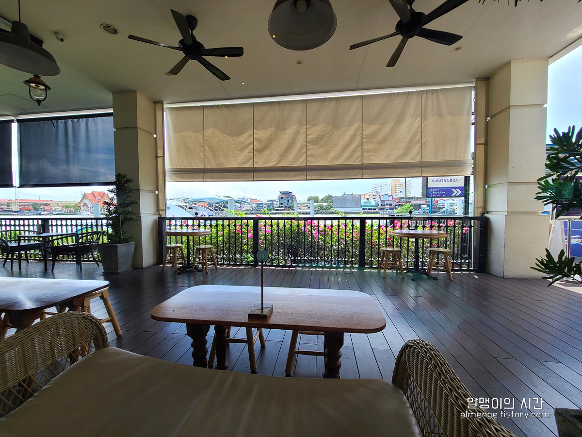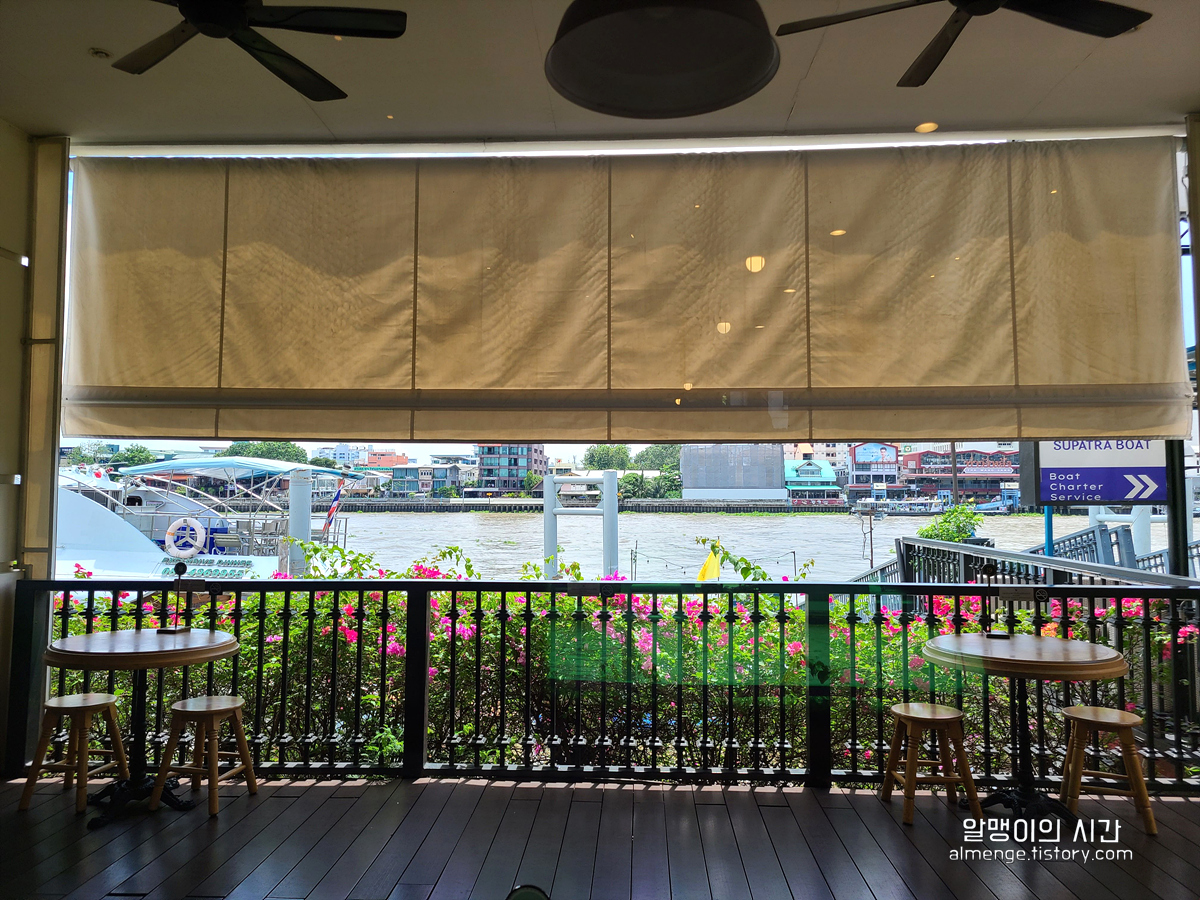창 밖으로 짜오프라야강이 보이는 자리가 비어 있길래 고민 없이 차지했다. 내부는 아담한 편