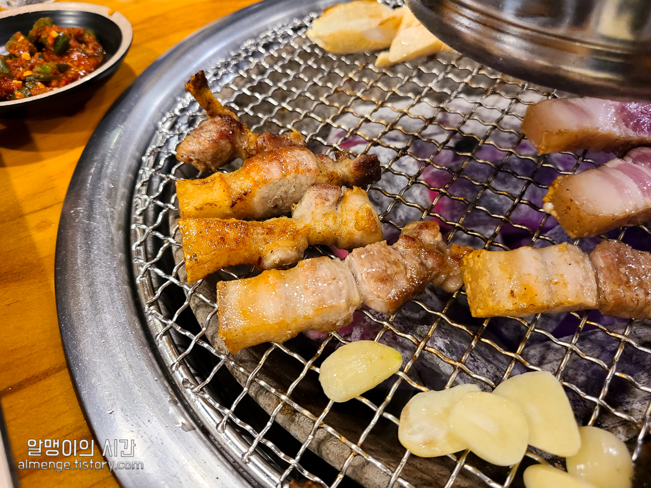 비록 돈사돈이나 칠돈가처럼 테이블에서 전담 직원이 직접 구워주는 서비스는 없지만, 초벌 후 커팅까지 되서 나오기 때문에 앞 뒤로 뒤집어 조금만 더 익혀 먹으면 돼요.