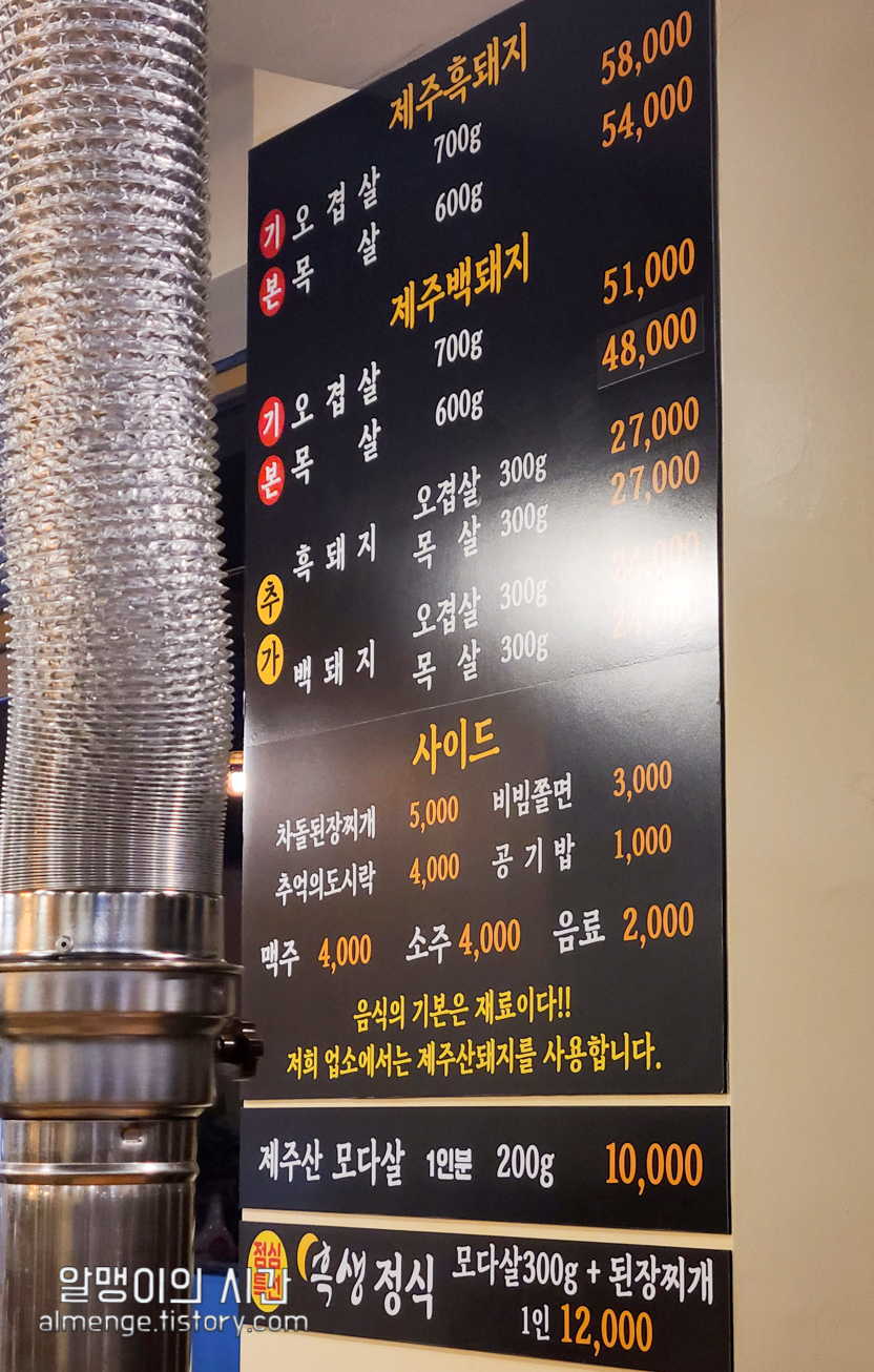 제주의 다른 흑돼지집들과 비교하면 저렴한 편이에요. 돈사돈, 칠돈가 등 보통 흑돼지 오겹살이나 근고기 식당들 가격을 보니 600g 기준으로 6만원 중반대 가격을 형성하고 있더라구요.