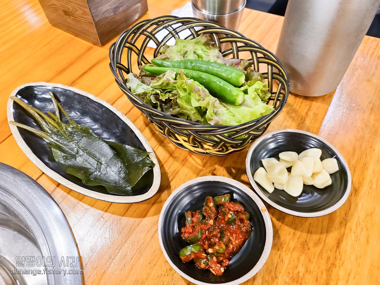 기본 상차림이에요. 백김치, 수제 피클, 명이나물, 고추 무침, 쌈채소 등이 기본 제공되요.