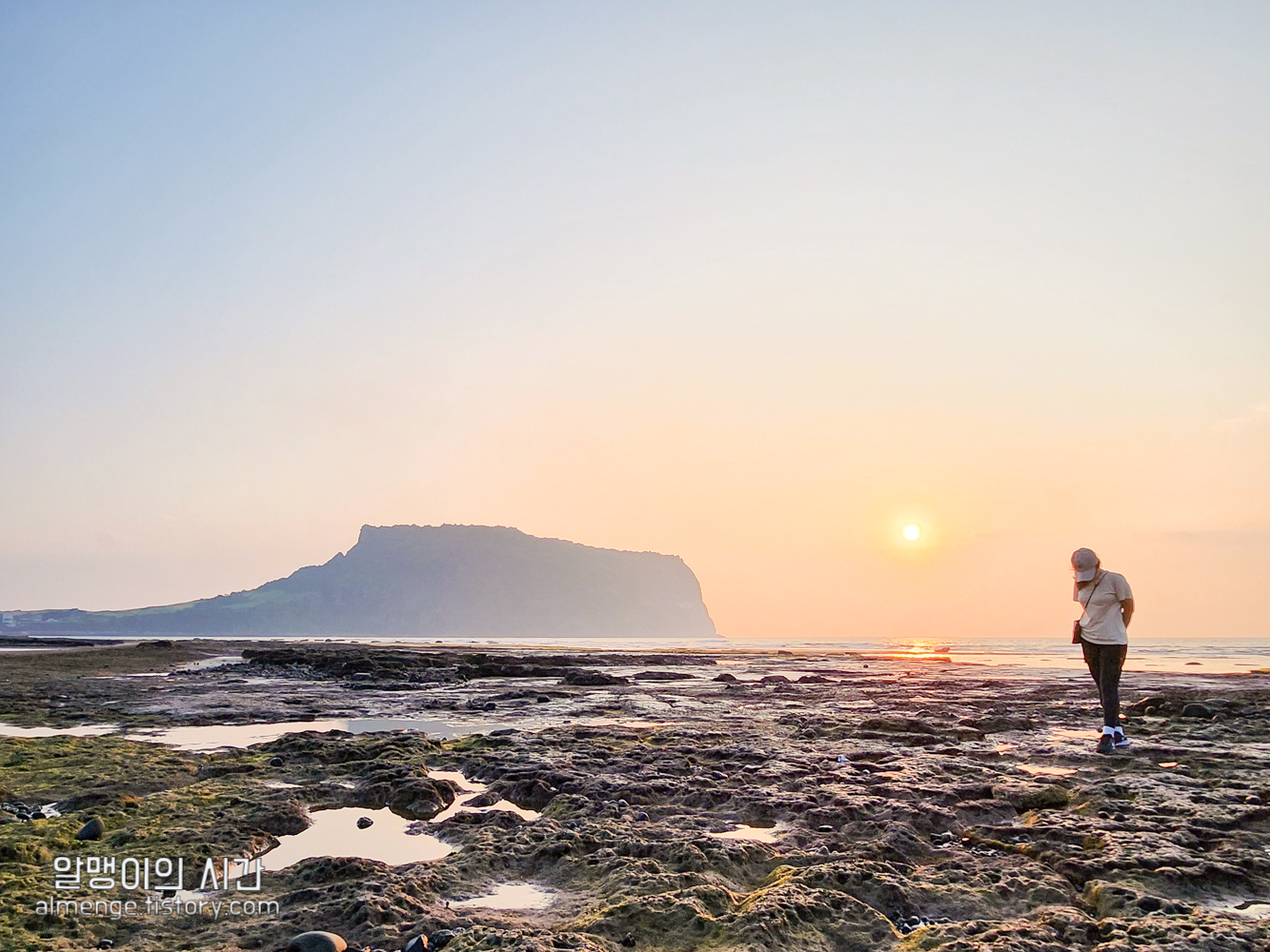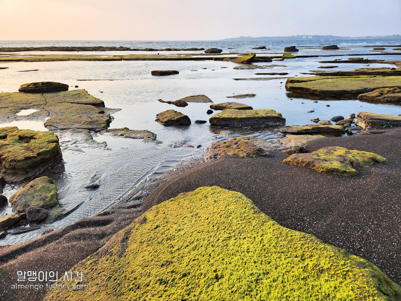 어제는 만조라 그냥 평범한 해변이었는데 간조가 되니 광치기 해변의 멋짐 포인트가 나타난다. 물에 묻혀있던 돌과 이끼가 드러나면서 펼쳐지는 신비로운 풍경에 눈을 뗄 수가 없었다.