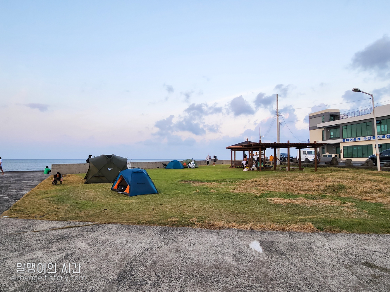 커플 캠퍼 옆에 안정적으로 안착! 오늘은 안심하고 꿀잠 잘 수 있다 ㅎㅎ 이 곳은 비록 평대 모래사장에서 보는 것보단 뷰가 예쁘진 않아도 나름 바다 앞 1열이고, 사람들이 많이 오가지는 않는 곳이라 박지 하기 나쁘지 않았다. 위에도 썼다시피 편의점, 화장실 접근성도 좋았고!