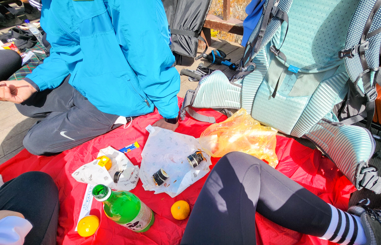 간월재에는 휴게소와 점심 먹을만한 데크, 테이블이 있는데 이미 많은 사람들로 점령당한 관계로 돗자리 깔고 앉아 바닥에서 밥을 먹기로 했다.