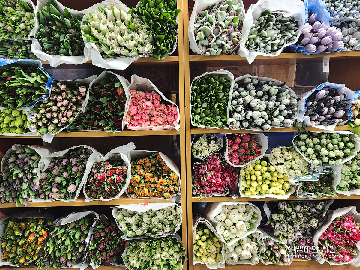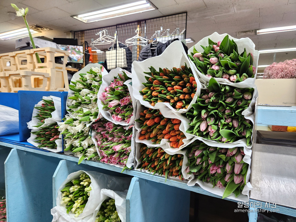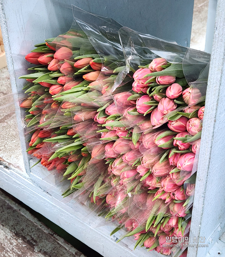 네덜란드에서 건너온 수입 튤립들도 형형색색 다양. 흔한 장미보단 튤립 생화를 사보고 싶어 가격을 여쭤봤는데 작은 사이즈 한 단에 15000~25000원 선이더라구요.