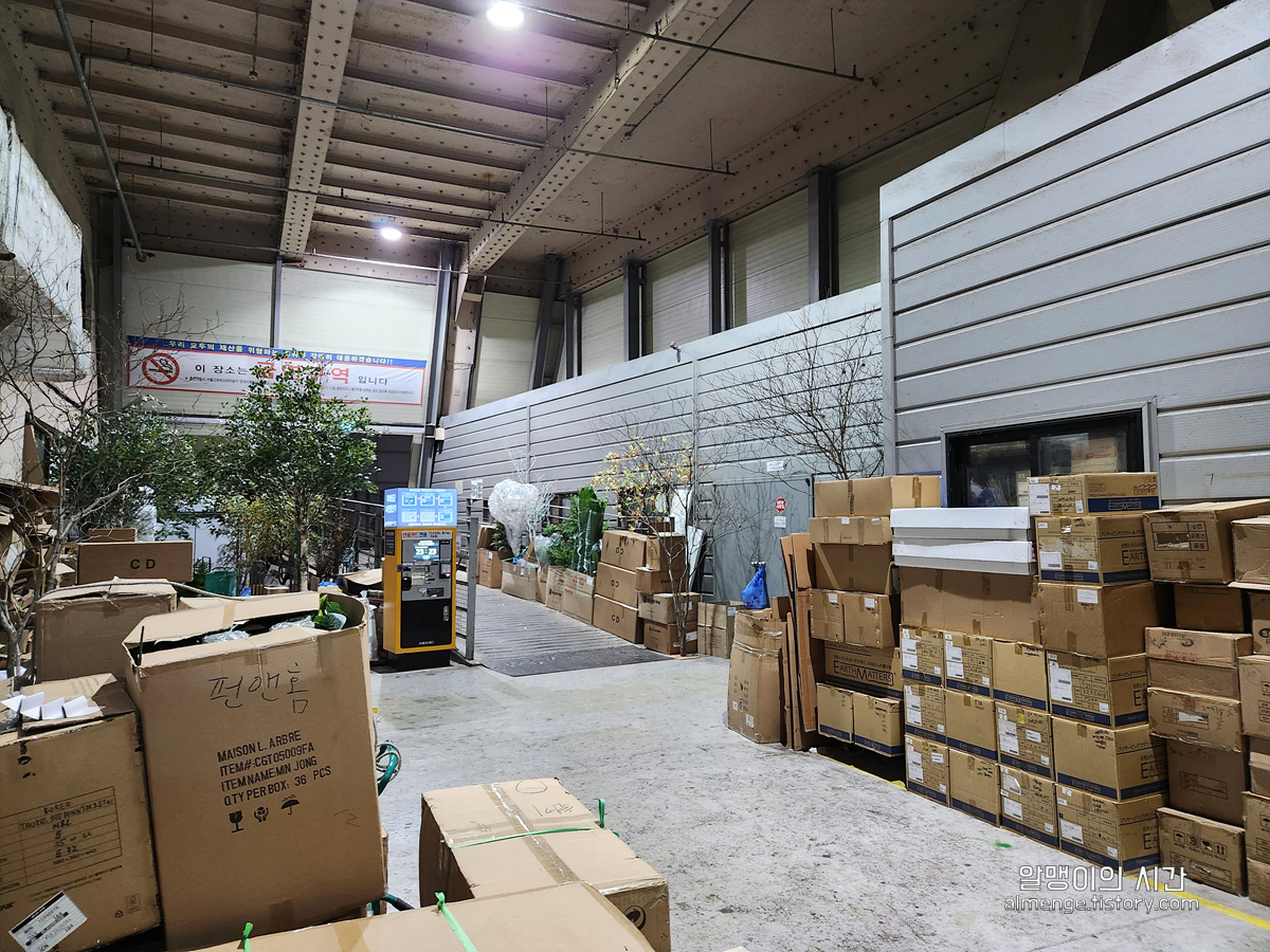 요론 박스들이 쌓여있는 곳을 뚫고 들어오시면 위 오른쪽 사진같은 유리문이 나오는데 여기가 꽃 상가 입구! 위 사진을 보면 노란색 주차 정산기도 보여요.
