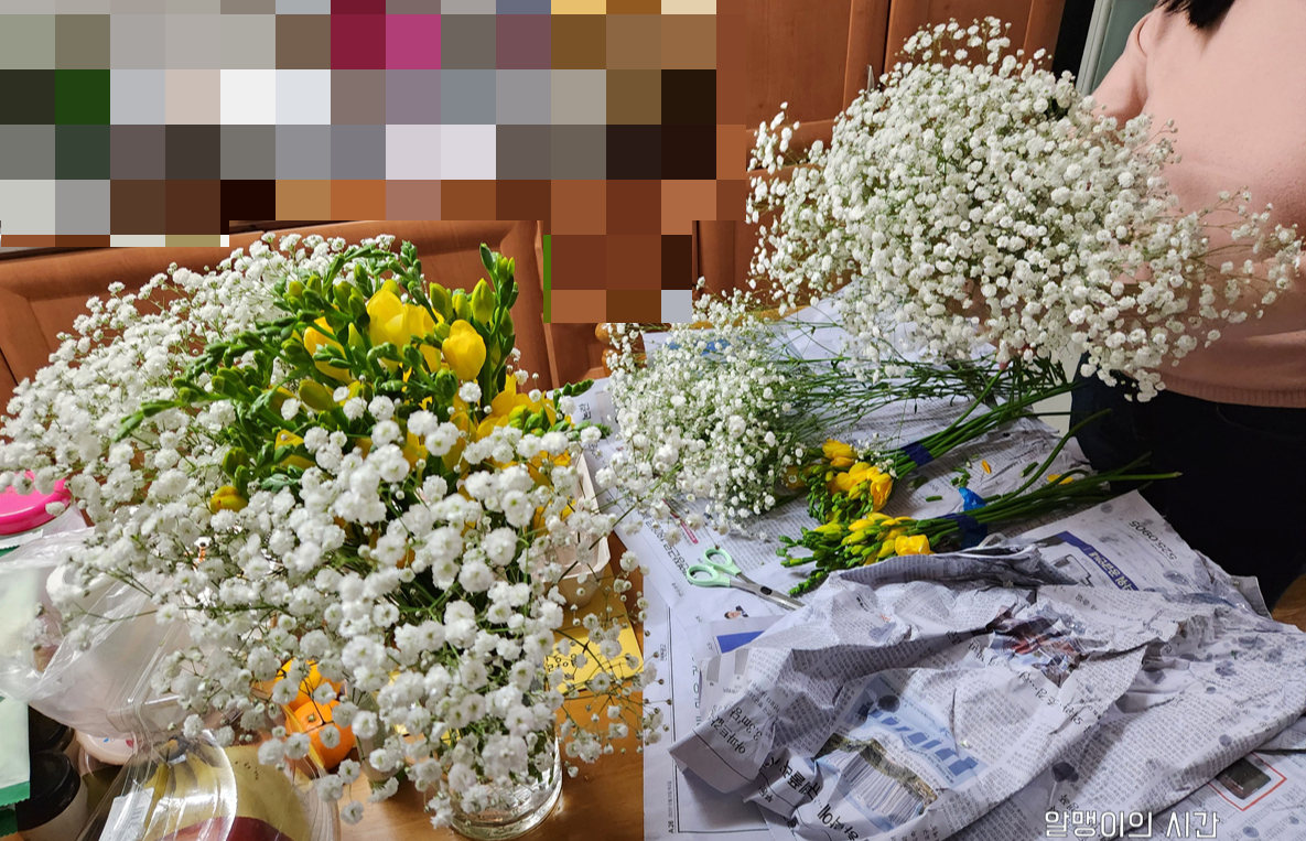 보통 안개꽃은 다른 꽃이랑 섞어서 꽃다발을 만드니 이거로 꽃집에서 꽃다발 만들면 다섯 다발 이상도 만들 수 있을 듯 했던 양이었어요.