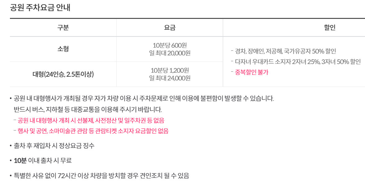 경차, 장애인, 저공해차량, 국가유공자의 경우 주차비 50%할인, 다자녀 우대카드 소지자 2자녀 25%, 3자녀 50%할인되구요.