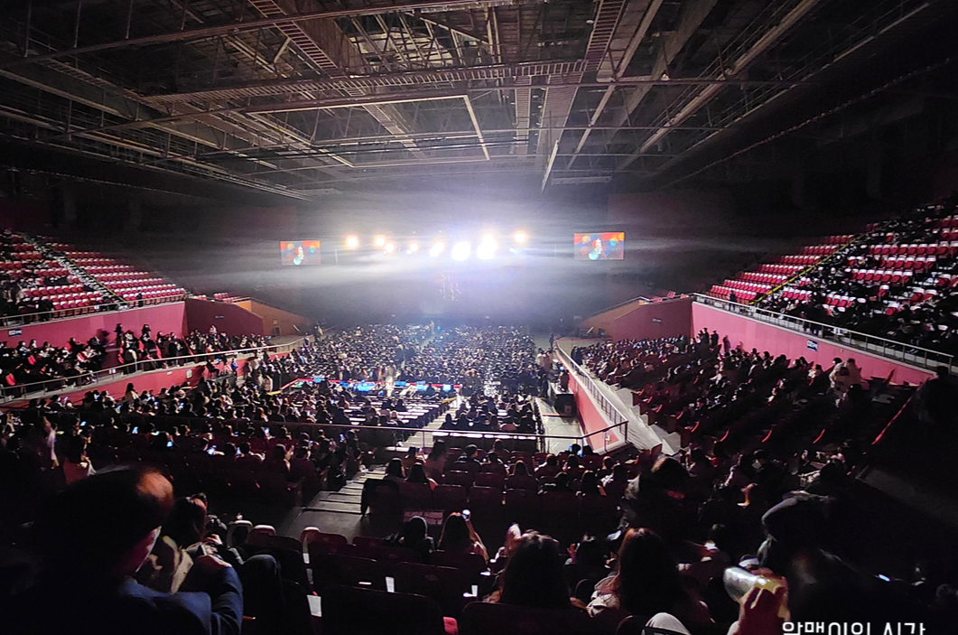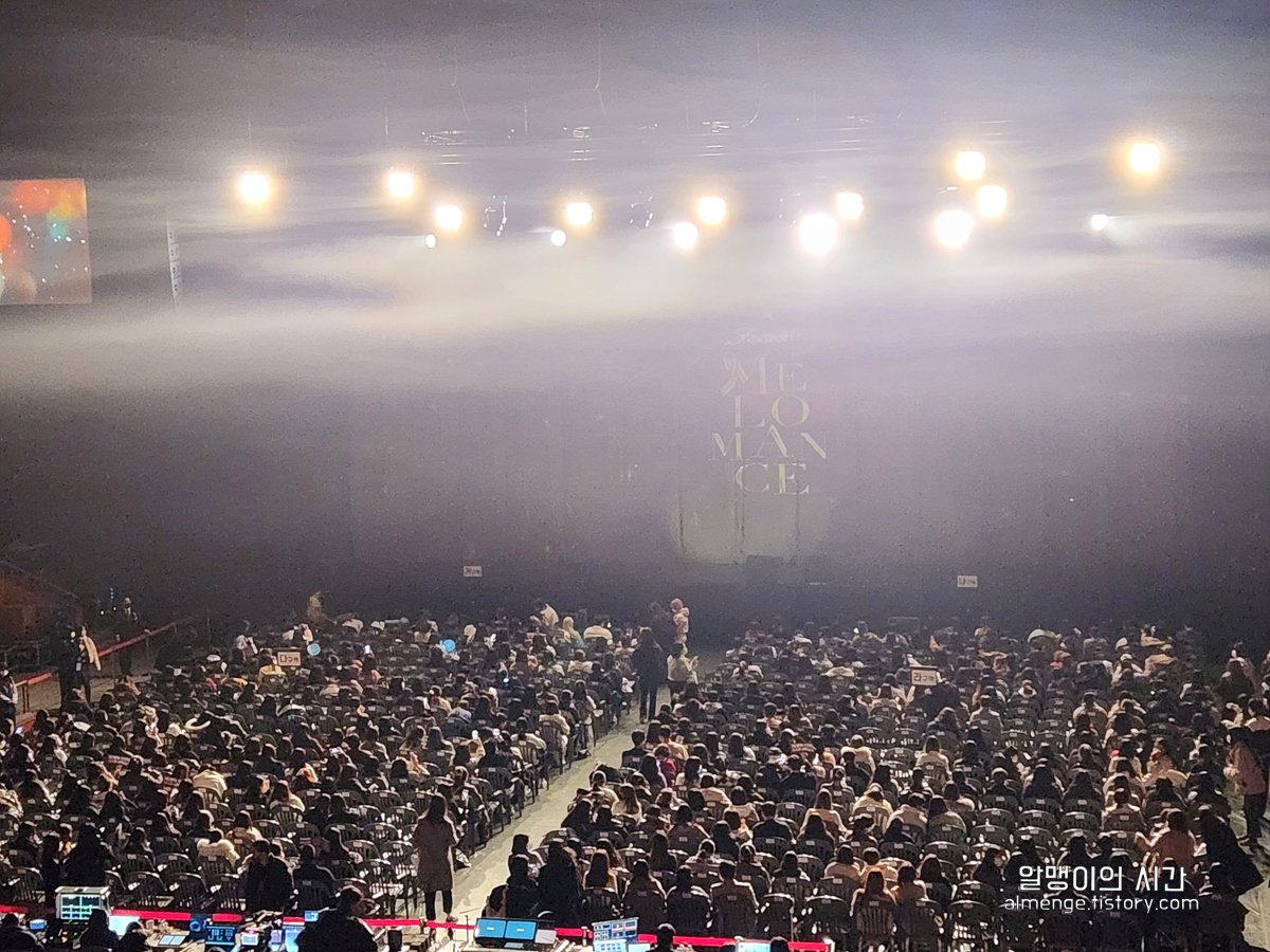 제 자리에서 보는 시야. 앞에 하얀 연기 뒤로 무대가 있어요. 위에도 썼다시피 거의 맨 뒤이기 때문에 가수 눈코입은 당연히 안보입니다. 올림픽홀이 작은 편이라 뒤에 앉아도 괜찮다던 후기를 본 것 같은데 실제로 가보니 그래도 C 11열은 멀고 멀다 ㅎㅎㅎㅎ