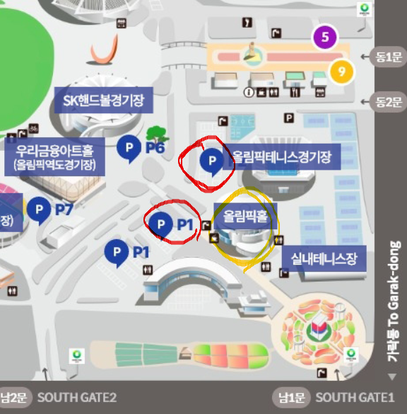 P2 주차장은 테니스 경기장 앞에 있는 주차장이에요. 근데 저는 네비말 안듣고 대충 들어갔다가 잘못 들어서 P1 주차장으로 빨려들어갔고...ㅎㅎ 하지만 P1에서 올림픽홀 가까운 쪽에 주차했더니 올릭픽홀 거의 바로 앞에 차를 댈 수 있었어요.