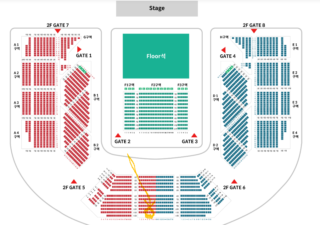이런 자리였는데 단차가 엄청 나서 앞에 키 큰 사람이 앉아도 시야 문제는 전혀 없음. 대신 뒷쪽이라 가수는 콩알만하게 보임ㅋㅋㅋ 시야는 안가리지만 시야가 멀어요. 가수 눈코입 당연히 안보여요 ㅎㅎㅎ