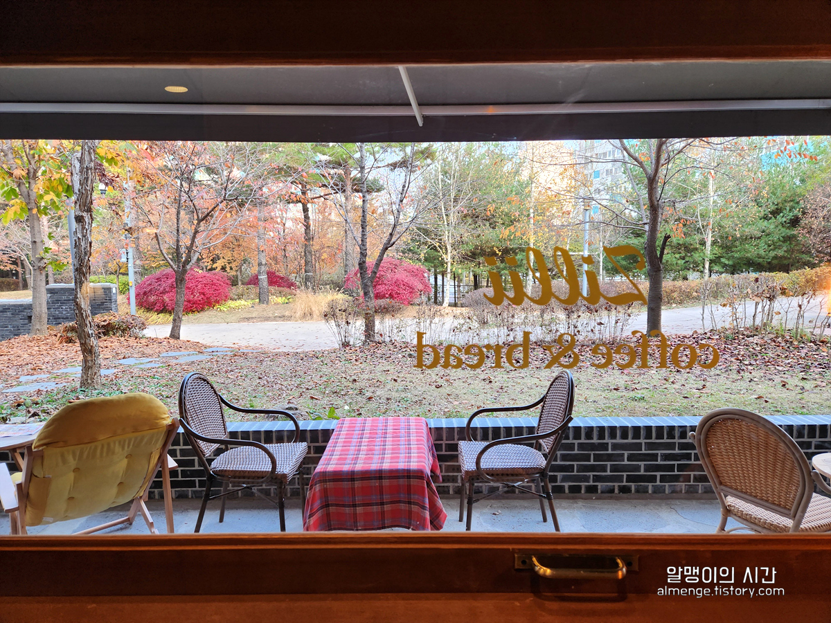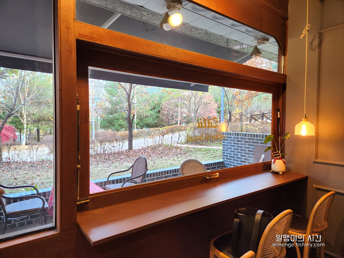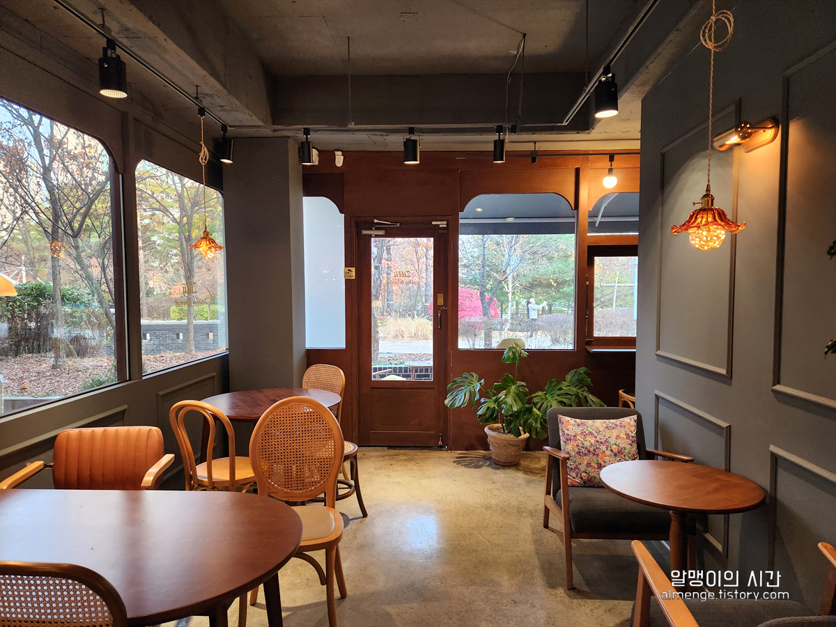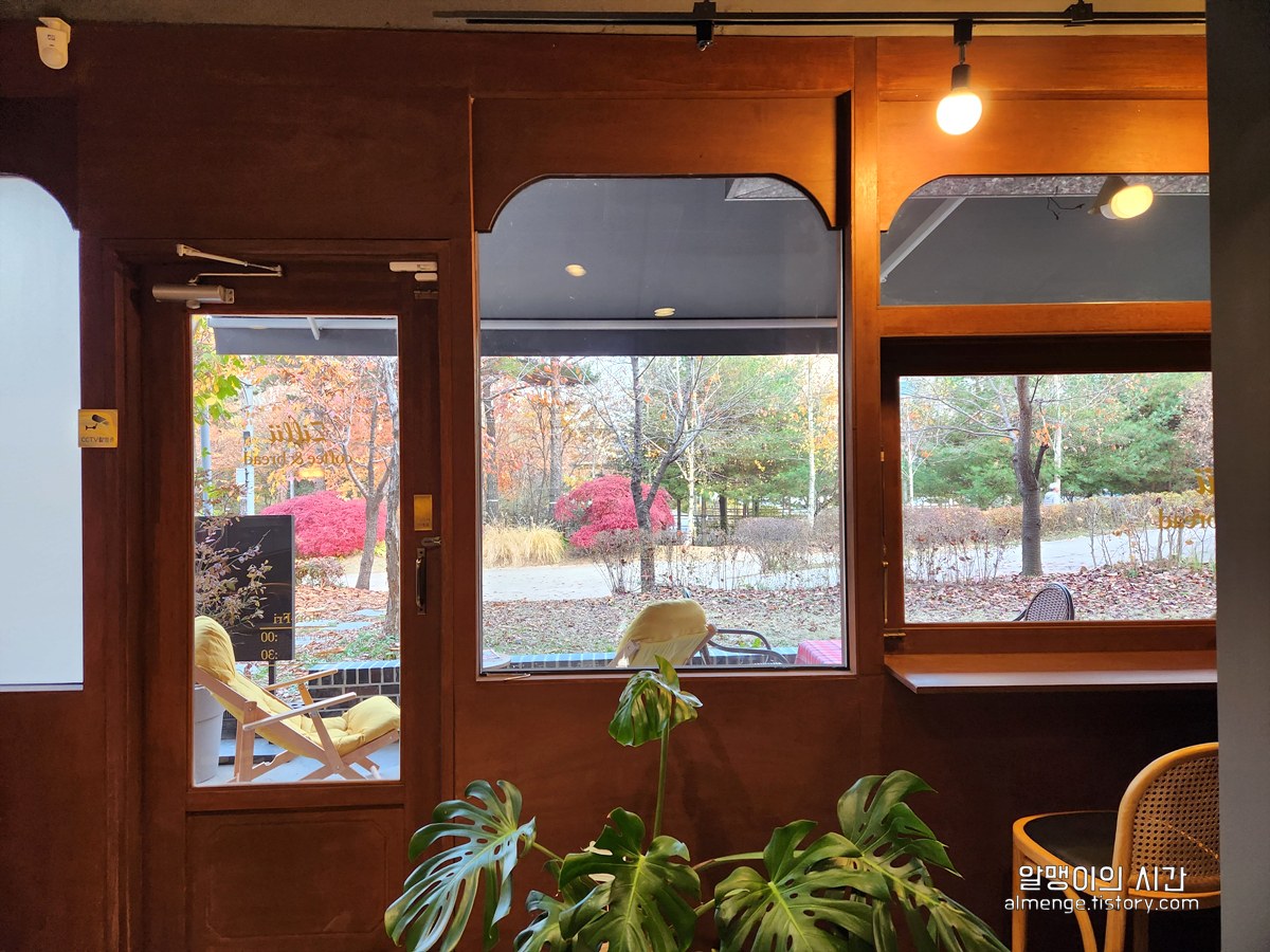 인테리어도 인테리언데 개인적으론 이 카페에서 볼 수 있는 파크뷰도 좋았어요. 공원 산책로가 보이는 풍경! 후기에 있던 사진들은 여름이었는지 온통 초록초록 했는데 제가 방문했을 땐 가을이어서 가을 느낌 가득한 창밖 모습!