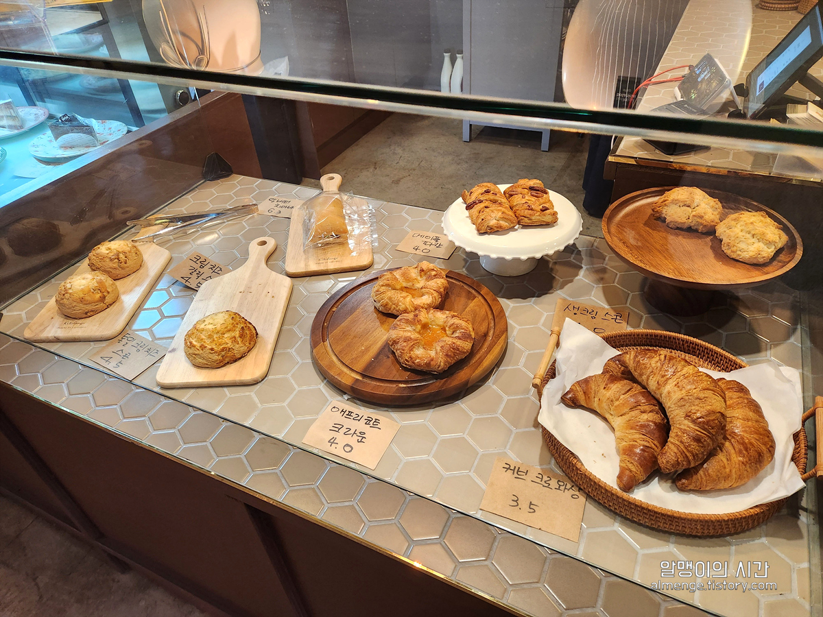 자리 잡았으니 주문하러 고고! 사장님이 직접 구운 빵들이었는데 크로와상, 메이플 피칸, 치아바타, 스콘 등이 있었고 특히 스콘 종류가 세 종류 정도 되더라구요. 그리고 스콘이 다른 곳들과는 달리 모양이 소보루빵처럼 동글동글했어요.
