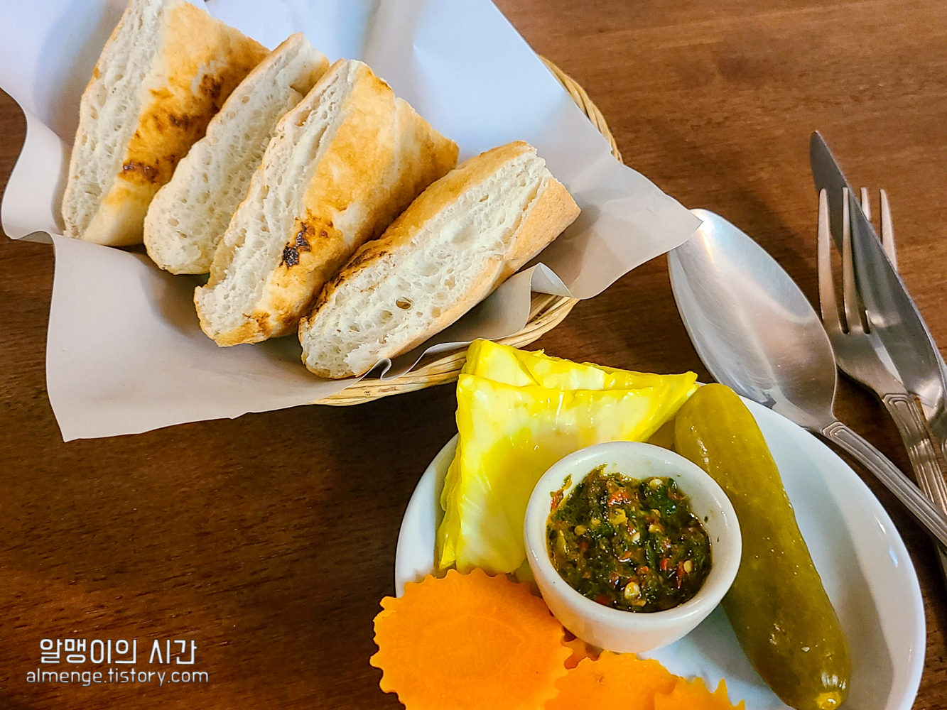 추가한 피타(위), 그리고 기본 반찬처럼 주는 수제 피클과 매운 Zhug 딥(아래). Zhug는 예멘식 매운 소스라고 하는데 콕 찍어먹어보니 진짜 제법 매콤