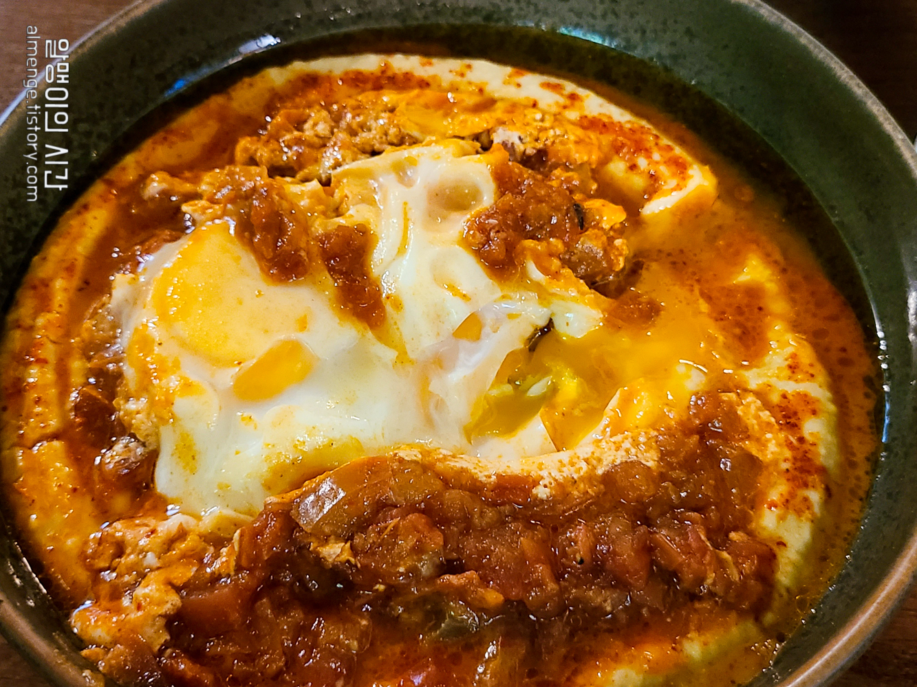 곁들이는 음식에 따라 여러 후무스가 있는데 내가 시킨건 샥슈카(에그인헬) 후무스라서 빙 둘러진 으깬 병아리콩 가운데에 샥슈카가 딱 들어가 있음. 샥슈카가 토마토 베이스 음식이기 때문에 색이 빨간데 구글리뷰 후기들 보면 다른 후무스들은 색이 다른 듯
