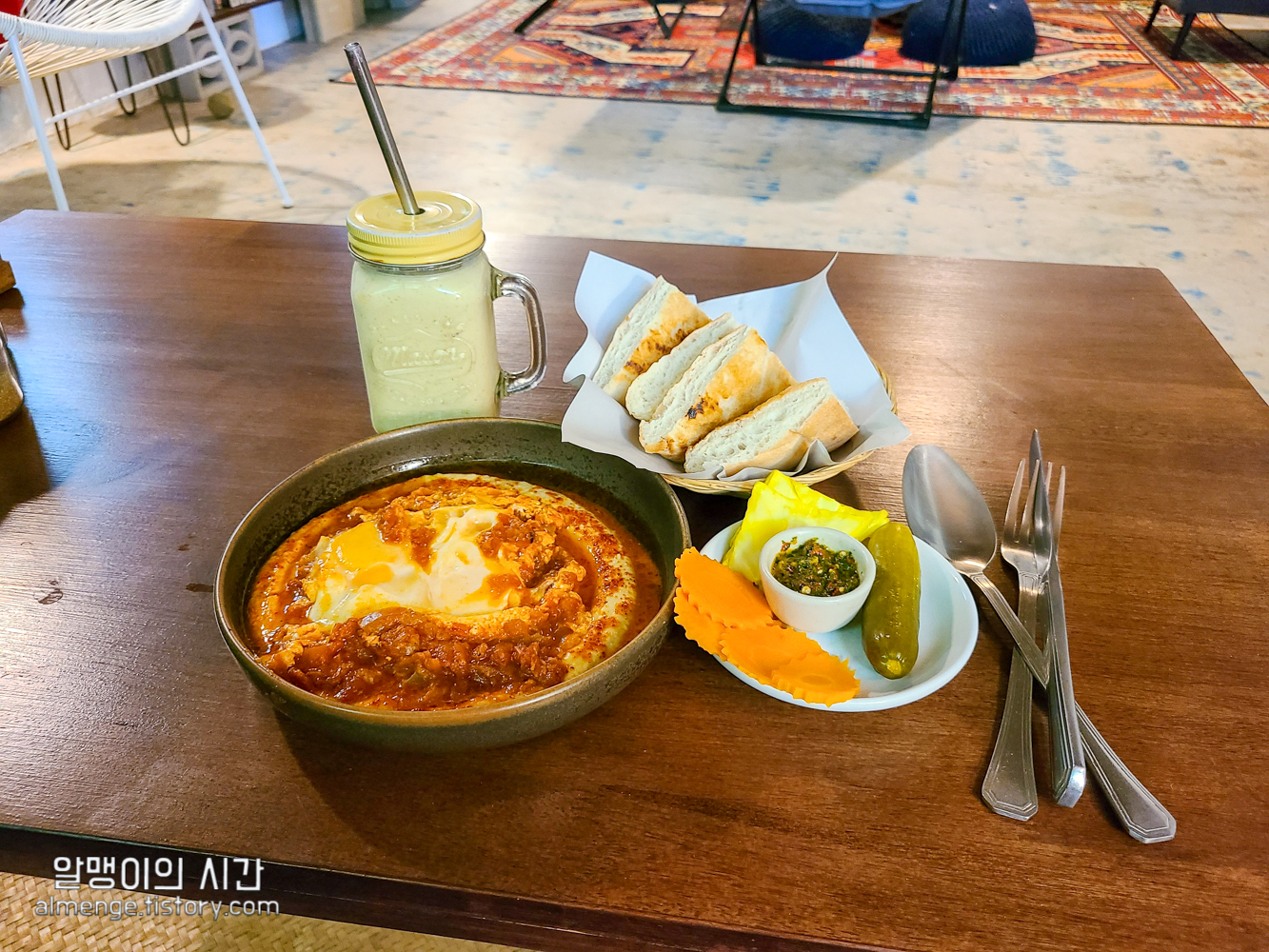 내가 시킨 후무스는 샥슈카(에그인헬) 후무스였기 때문에 토마토 소스 베이스였고 적당히 익은 달걀 반숙이 들어가있었는데, 에그인헬은 한국에서도 종종 먹던 메뉴여서인지 제법 익숙한 맛이어서 훔무스와 어울려 부담 없이 맛있게 먹을 수 있었다. 담백한 후무스의 맛을 샥슈카가 적당히 기름지게(?) 중화시켜 줘서 거부감 없었음