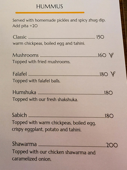 이곳에는 이스라엘식 아침식사, 샥슈카, Malawach, egg in a nest 등의 아침메뉴가 있고, 몇 가지 생소한 샐러드 메뉴, 그리고 6가지 종류의 후무스, 피타 포켓 샌드위치들을 파는데, 후기를 보니 후무스와 피타 포켓 샌드위치가 인기 메뉴인듯해서 고민하다 후무스를 먹어보기로!