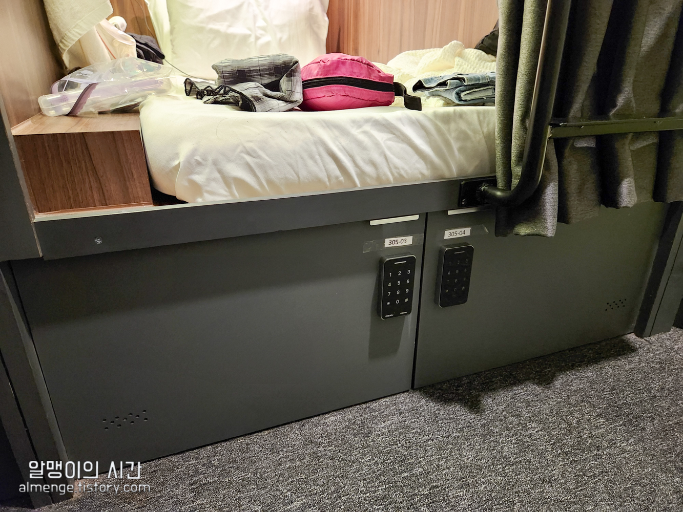 침대 아래는 비밀번호로 잠글 수 있는 개인 락커가 있어 중요한 소지품은 여기에 보관하면 됨!