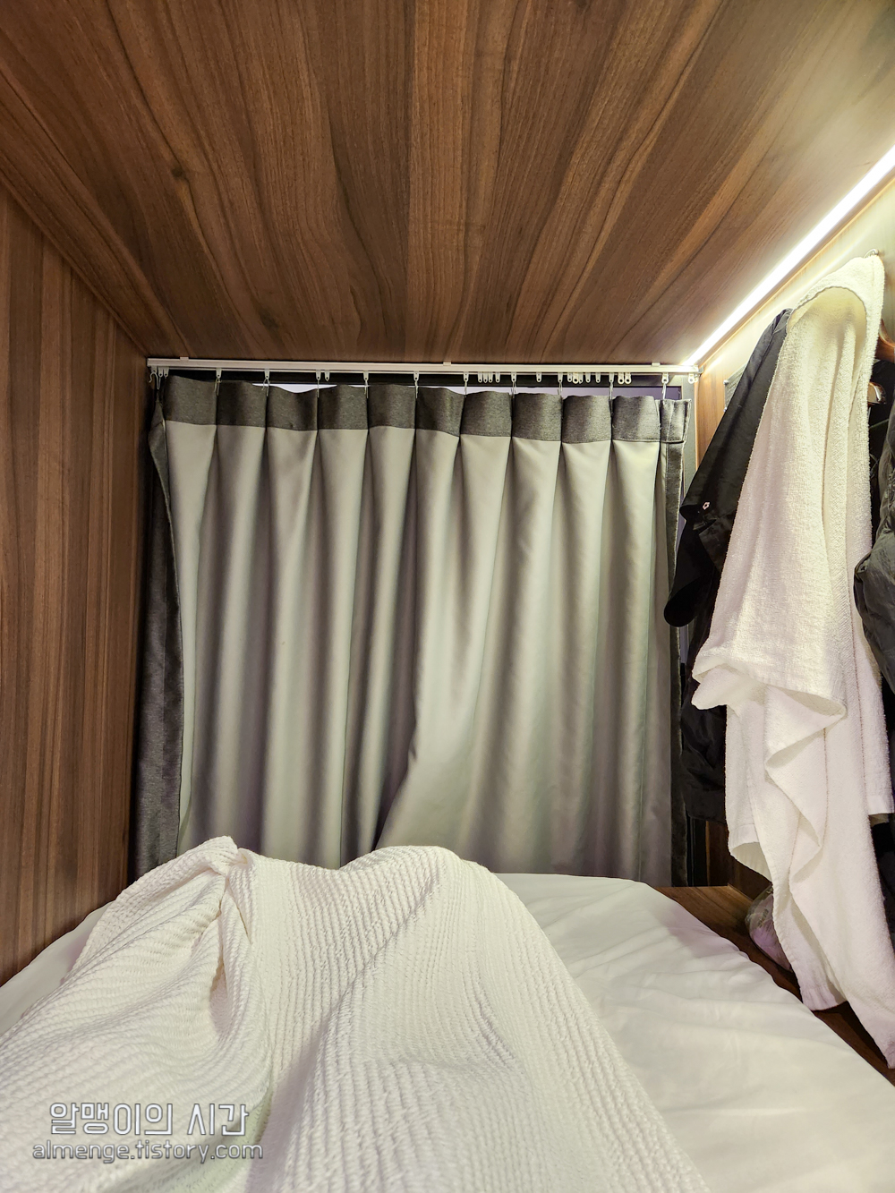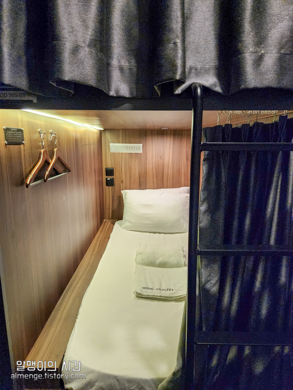 내 침대. 캡슐 호스텔이라 관짝 너낌은 어쩔 수가 없다 ㅋㅋㅋ 정말 딱 잠만 자기 좋음. 하지만 나름 개인 조명, 콘센트, 옷걸이, 커튼이 있어 다인실이지만 프라이빗하게 지낼 수 있다.
