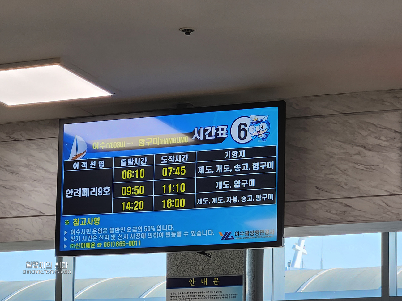 난 이용하지 않았지만 이 루트가 궁금하신 분도 계실 것 같아 신아해운 운항 시간표를 첨부한다.
