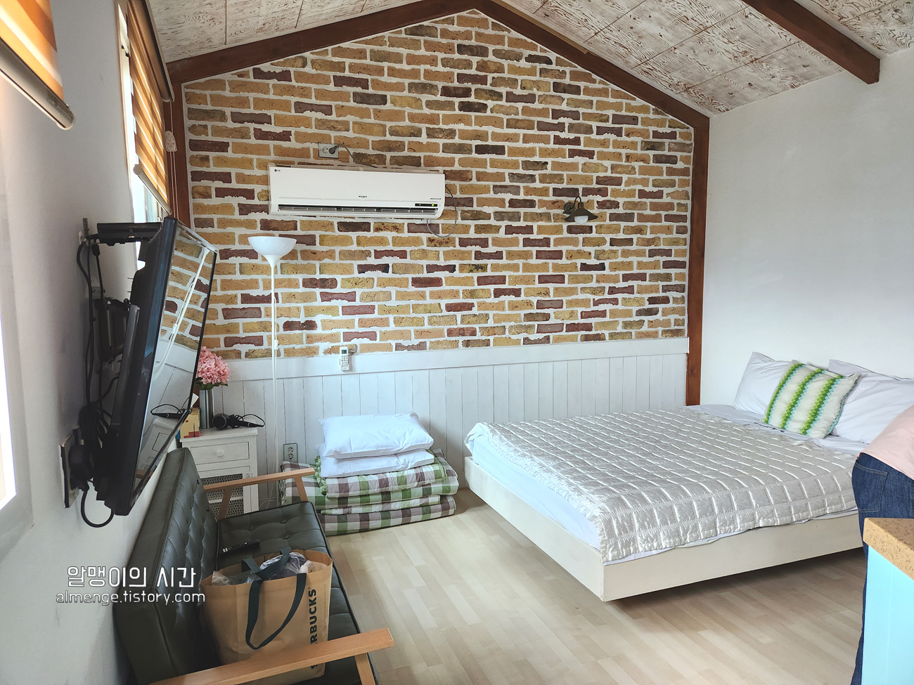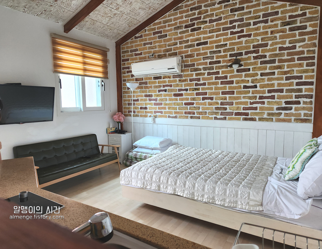 방은 작지만 티비, 소파, 테이블, 주방 시설 등이 다 갖춰져 있었어요. 침구도 화이트컬러 침구인데 깔끔하게 관리되고 있는 느낌이 들어 좋았어요. 보통 좀 관리 안되는 펜션가면 이불 찝찝하고 그런데 여긴 그런게 없어서 좋았음