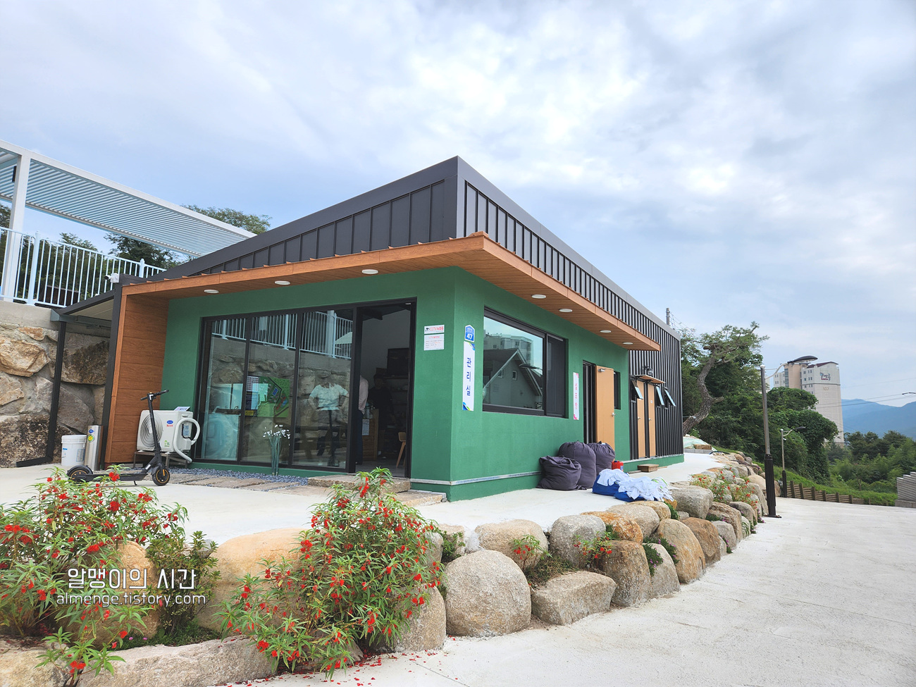 네비에 "다섯 번째 계절 풀빌라"를 치고 가다보면 다 와갈 때쯤 골목길이 나오고 길 따라 오다보면 나오는 초록색 관리실 건물!