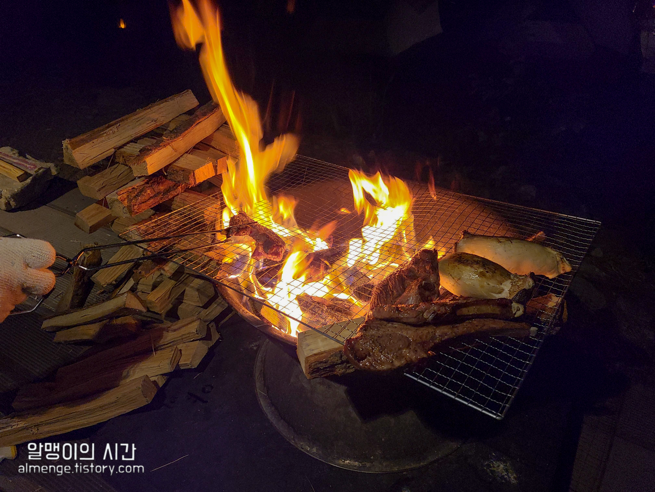 사실 불이 저렇게 타오를 땐 고기 올리면 절대 안됩니다!!! 다 타요 ㅋㅋㅋㅋ 큰 불길이 잦아들 때쯤 고기 올리는게 베스트.
