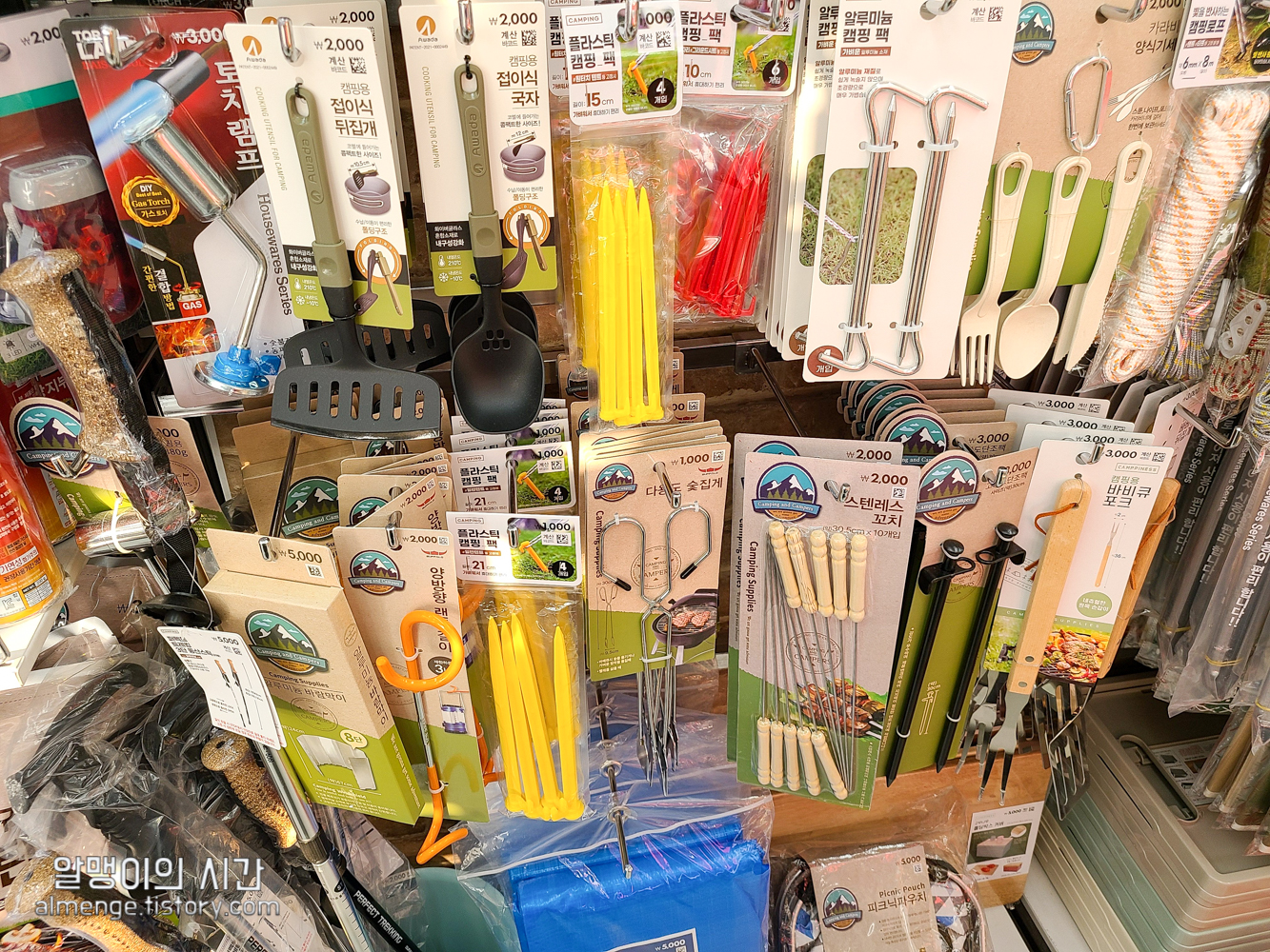 위 사진 전체가 다 캠핑용품인데 사실 이 정도는 그다지 많은 편은 아니에요. 더 많은 지점들도 있어요. 화기&취사도구 관련 도구, 텐트팩, 캠핑 테이블 등의 캠핑도구들을 취급하고 있습니다.