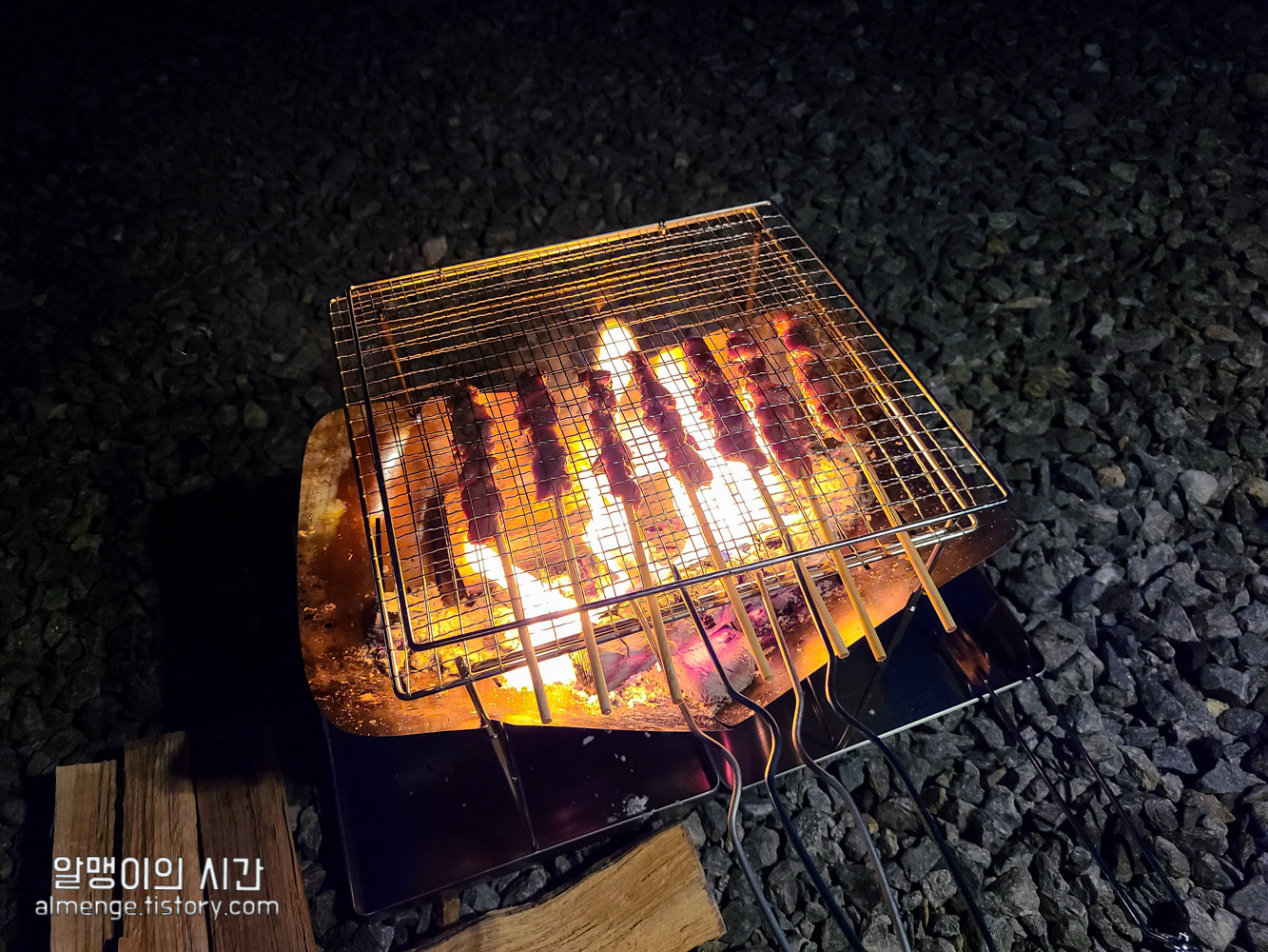 그후 붙불은 고체연료 위에 이렇게 장작을 하나씩 올리면 불이 꺼지지 않고 활활 잘 타오르다가 나무로 옮겨 붙어요. 부채질이나 토치질 1도 필요 없어요. 하나로도 충분하면 하나만 쓰고, 좀 더 빨리 타오르게 하고 싶으면 고체연료 2개쯤 넣으시면 됩니당