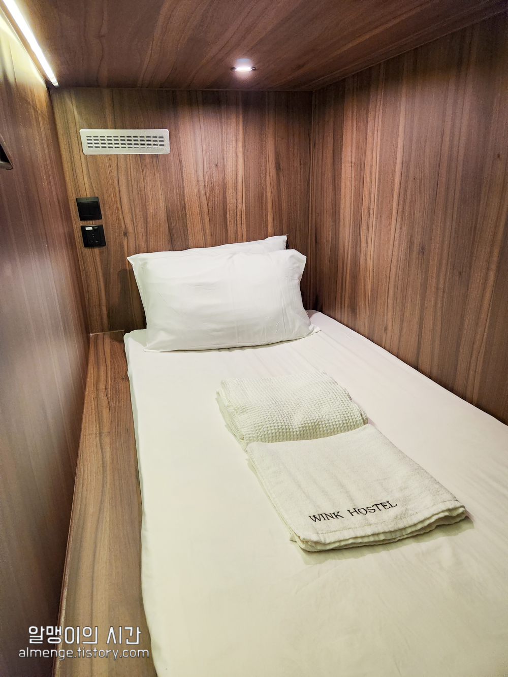 그래도 관짝 치고는 옷걸이도 있고, 개별 콘센트와 조명도 갖춰져 있어 꽤나 아늑한 관짝이다. 나름 환기구 구멍도 있음 ㅎㅎ 수건도 무료로 1장 준다.